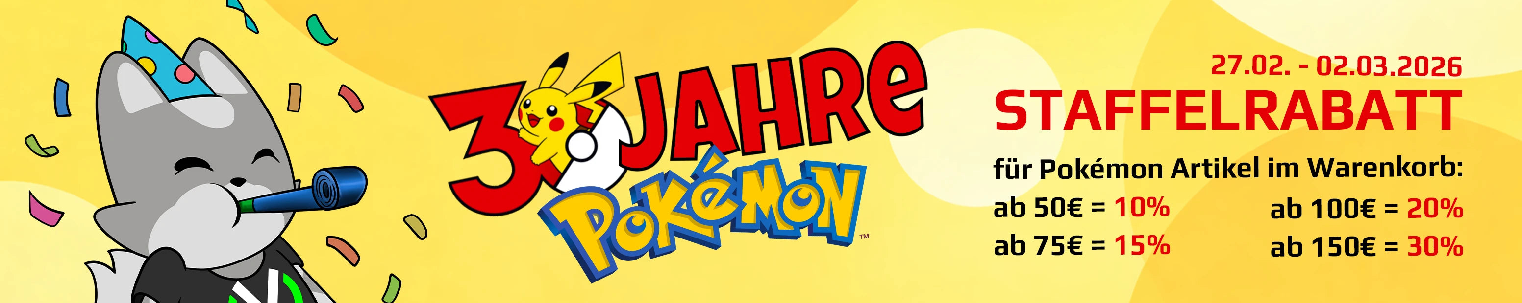 Mindestbestellwert ab 50 € → 10 %, ab 75 € → 15 %, ab 100 € → 20 %, ab 150 € → 30 %, gilt nur auf die Kategorie Pokémon, nicht mit anderen Rabatten kombinierbar, gültig 27.02.–02.03., Rabatt wird automatisch im Warenkorb abgezogen.