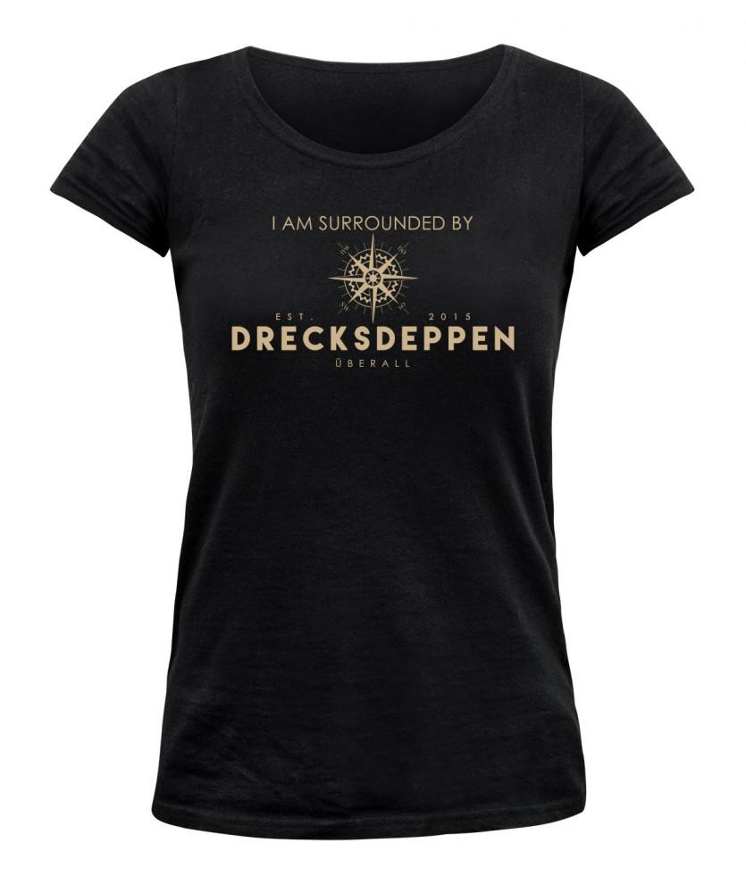Das Shirt zeigt den Slogan "I am surrounded by Drecksdeppen!".