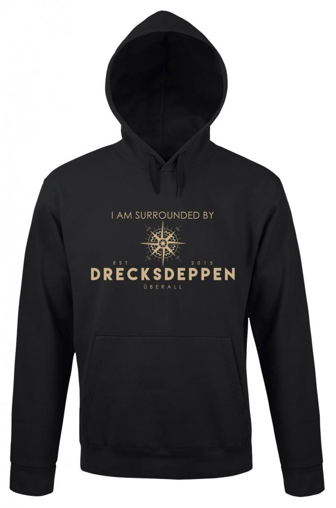Der Hoodie zeigt den Slogan "I am surrounded by Drecksdeppen!".