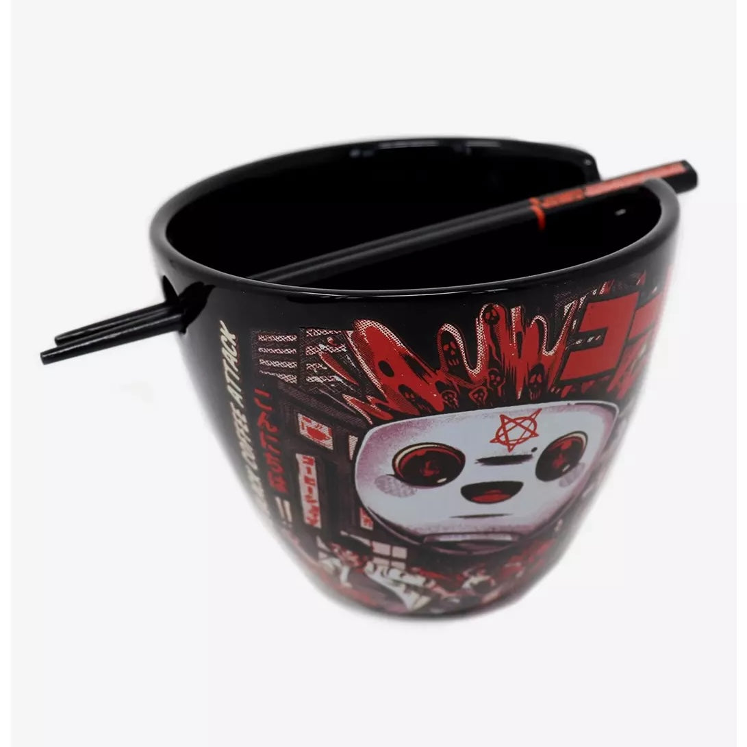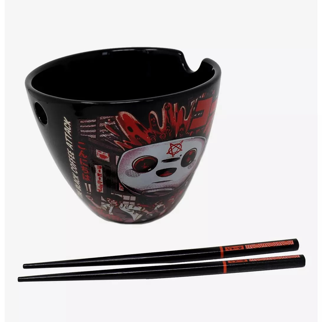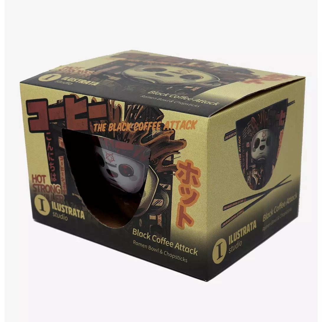 Die Schüssel zeigt eine riesige Kaffeetasse, die eine Stadt angreift und den Spruch "Black Coffee Attack".