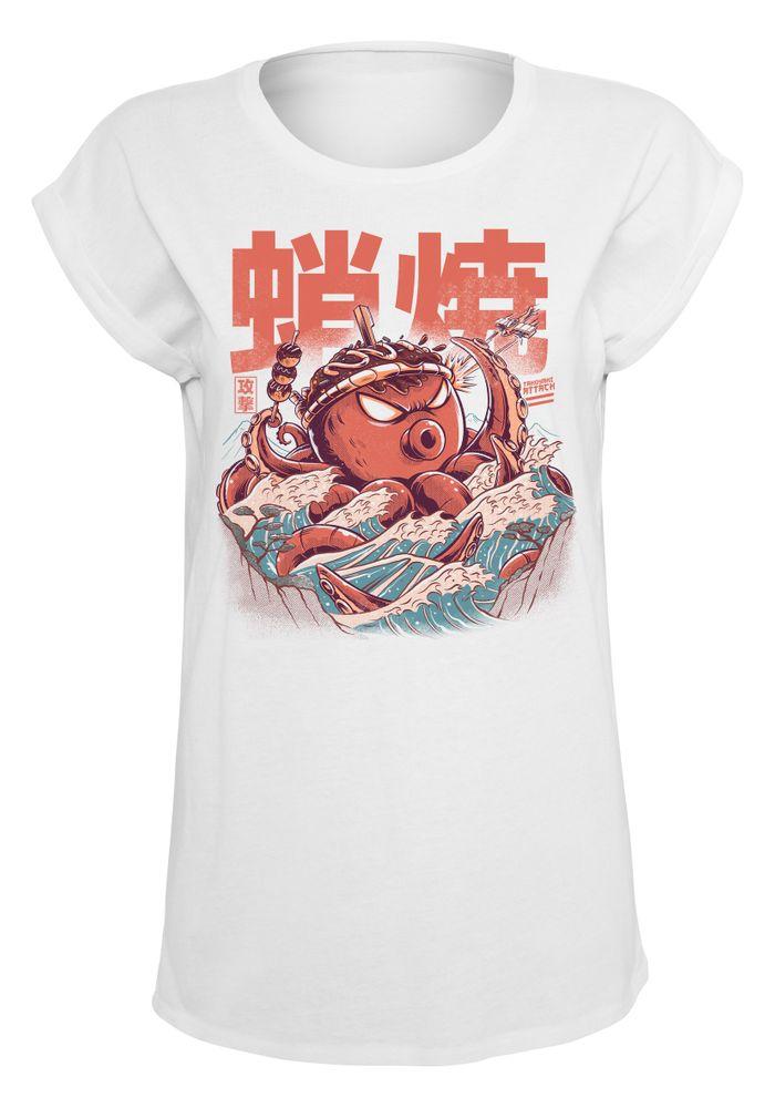 Das Shirt zeigt einen riesigen wütenden Oktopus, der im Meer randaliert.