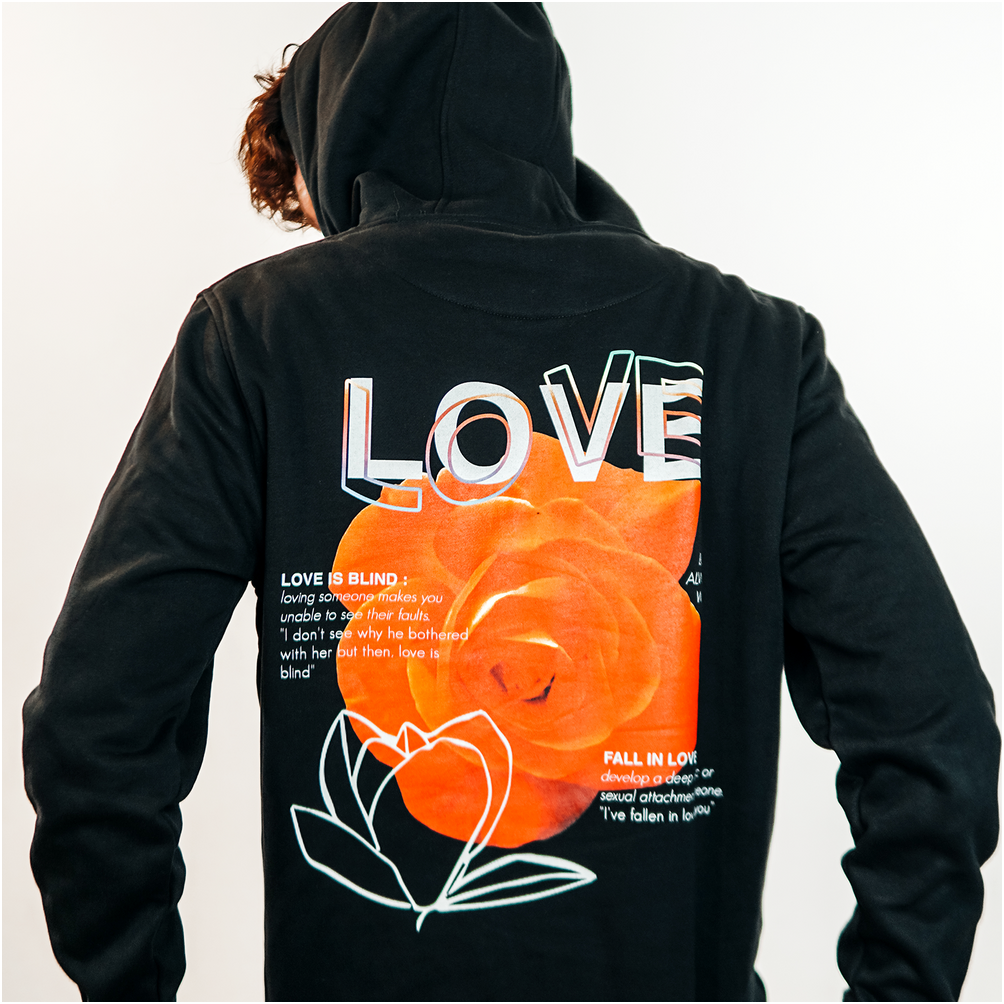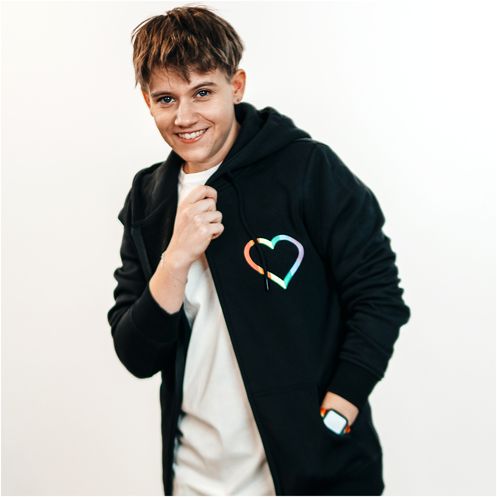 Der schwarze Zipper zeigt vorne ein kleines Herz in Regenbogenfarben. Auf der Rückseite hat er eine orangefarbene Rose.