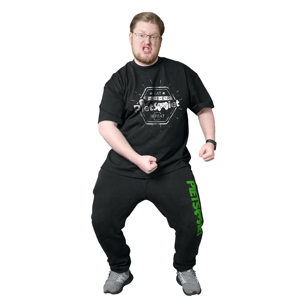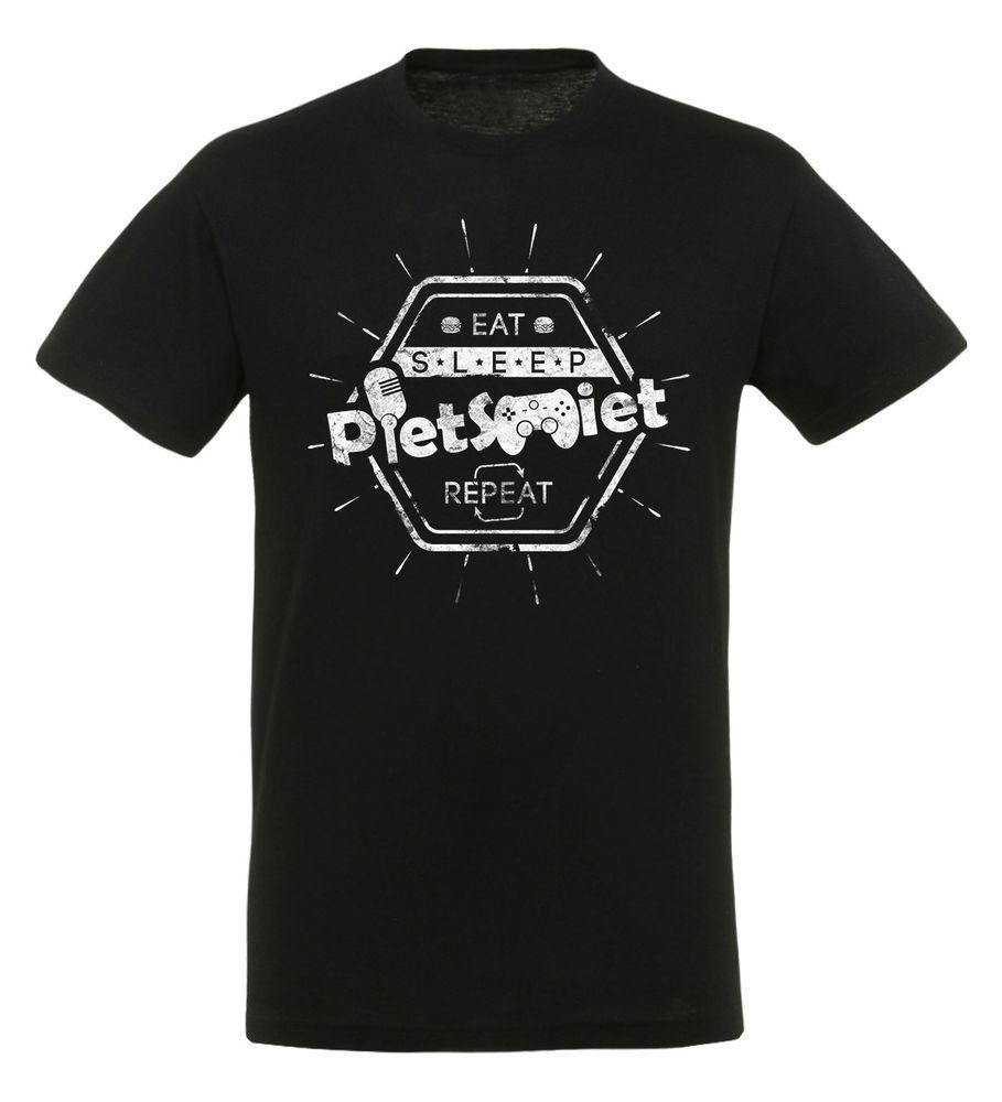 Das schwarze Shirt zeigt Eat Sleep PietSmiet Repeat in einem 6-Eck.