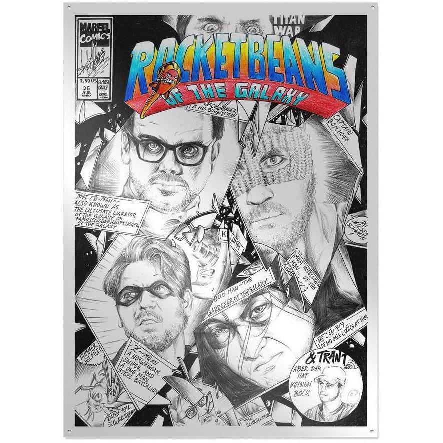 Auf dem Metallschild sieht man die Beans als Superhelden unter dem Titel Rocketbeans Of The Galaxy.