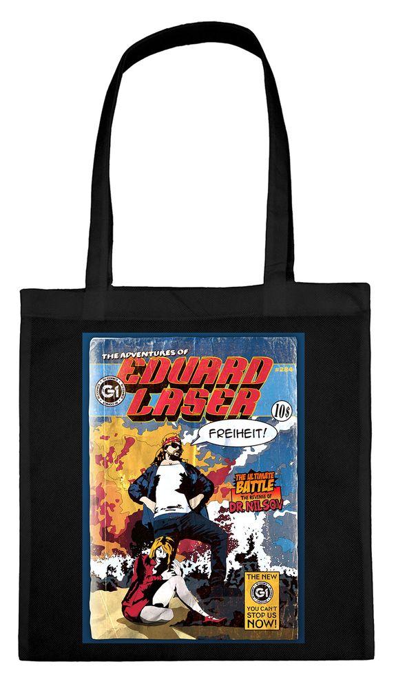 Der schwarze Beutel zeigt ein Comiccover von Eduard Laser.