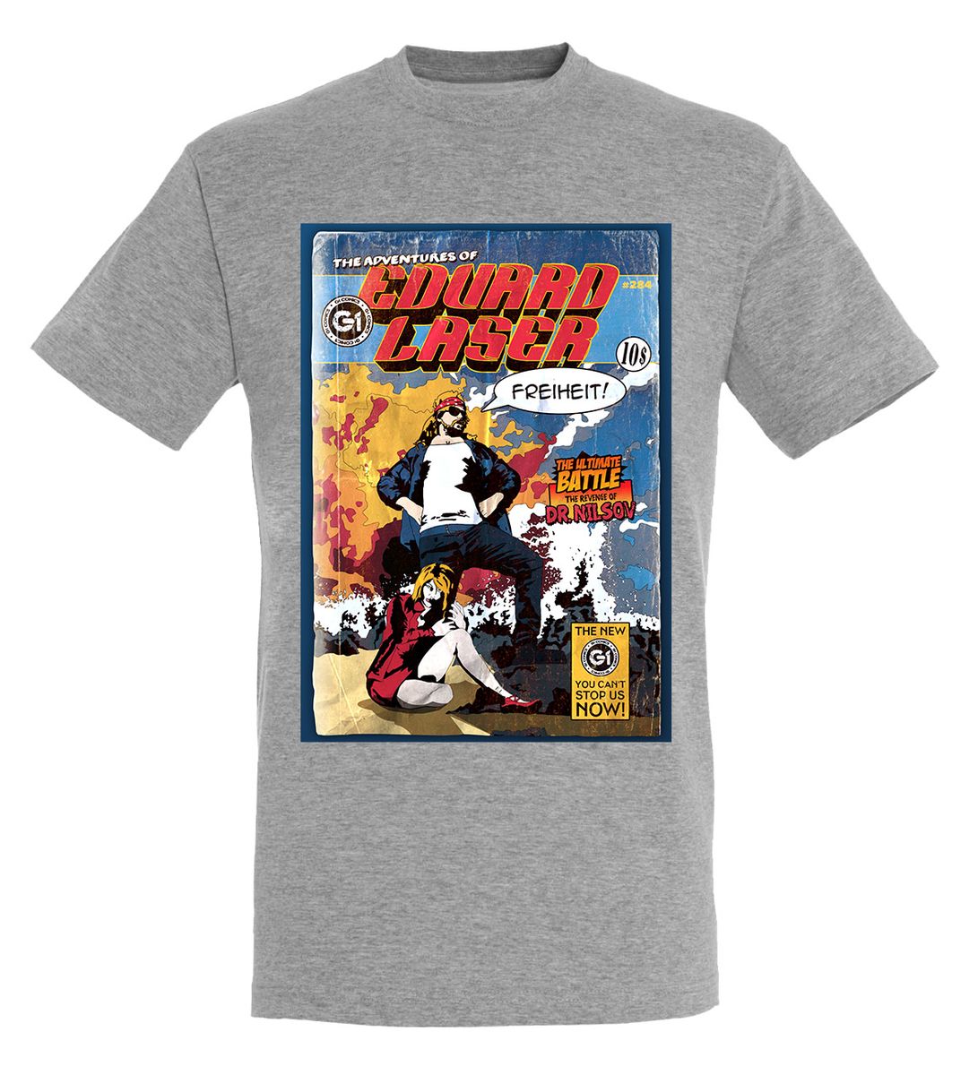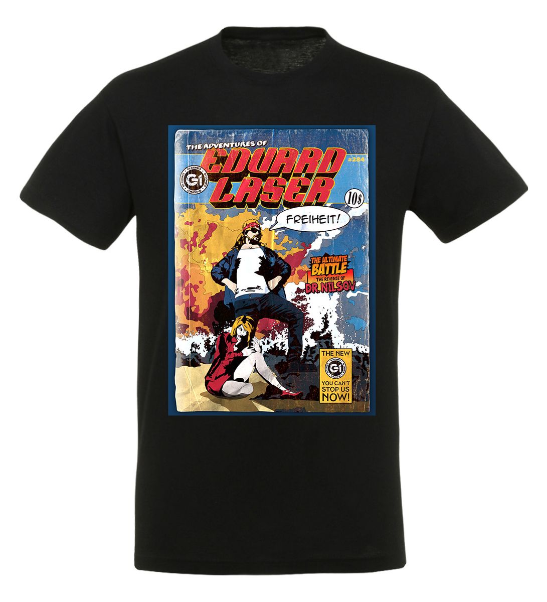 Das T-Shirt zeigt ein Comiccover von Eduard Laser.