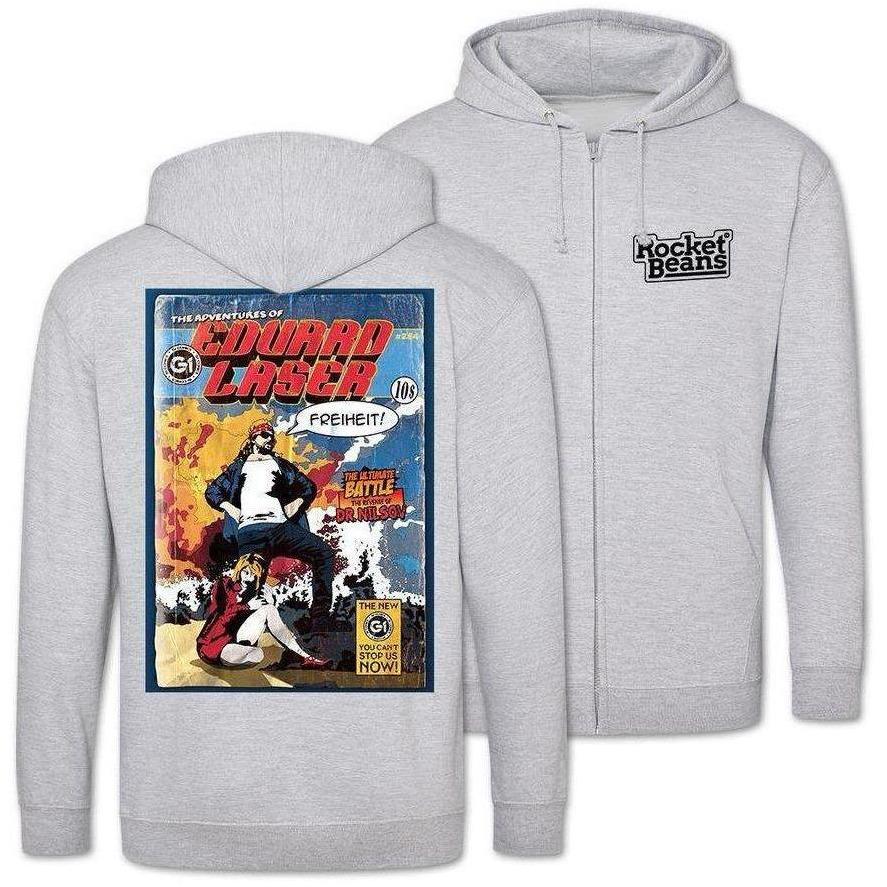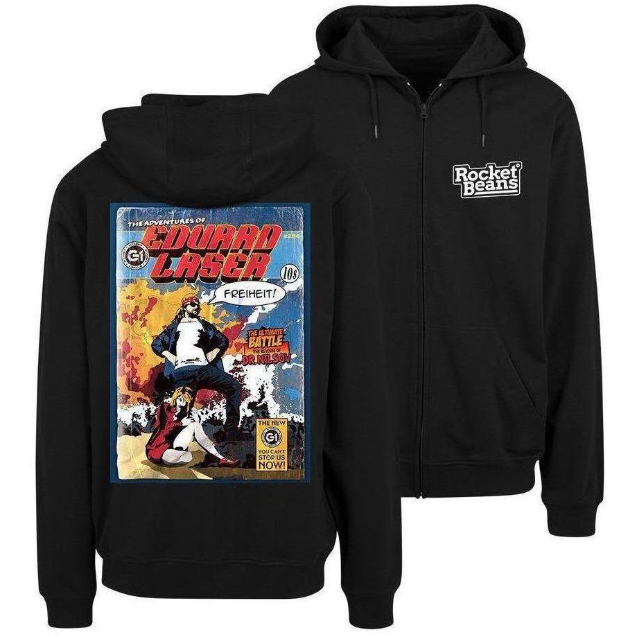 Der Zipper zeigt vorne Rocket Beans und hinten ein Comiccover von Eduard Laser.