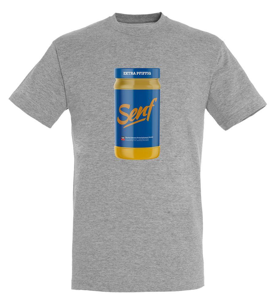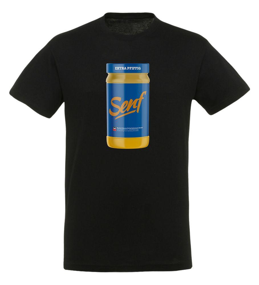 Das T-Shirt zeigt ein Senfglas mit der Aufschrift "Senf" und "Extra Pfiffig"