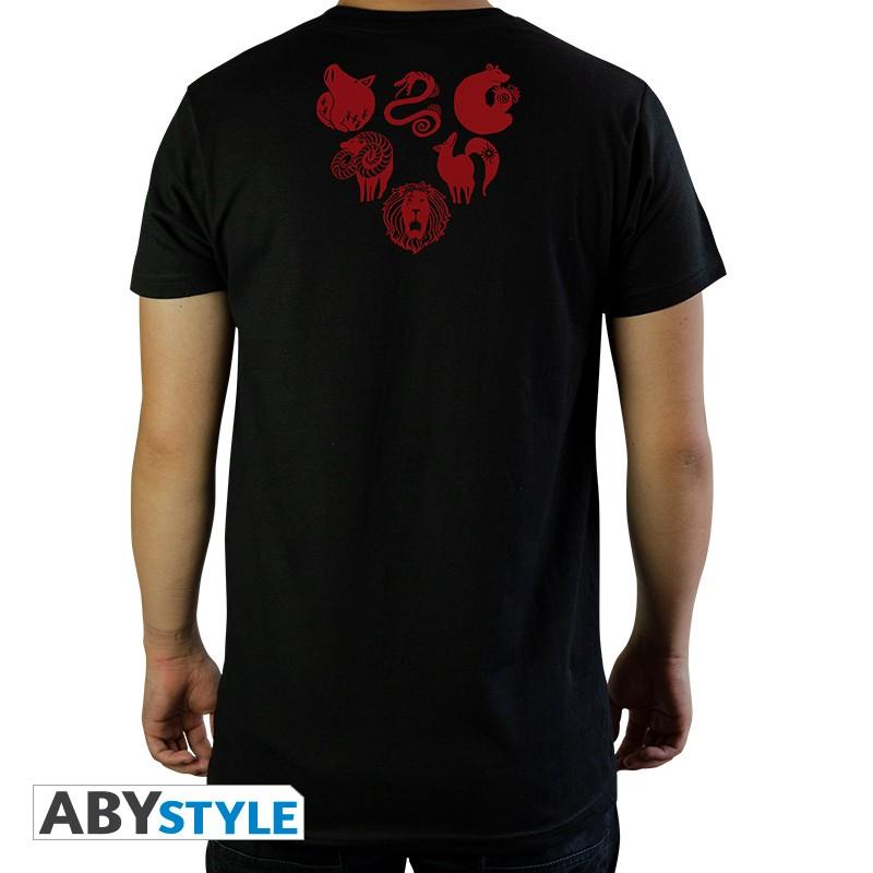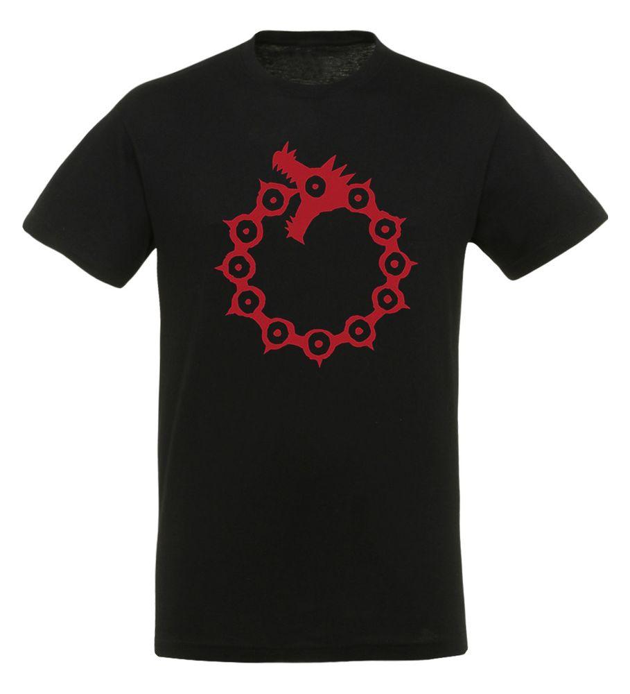 Das Shirt von Seven Deadly Sins zeigt auf dem Rücken die Embleme der 6 Todsünden. Auf der Brust prangt das Emblem von Meliodas.