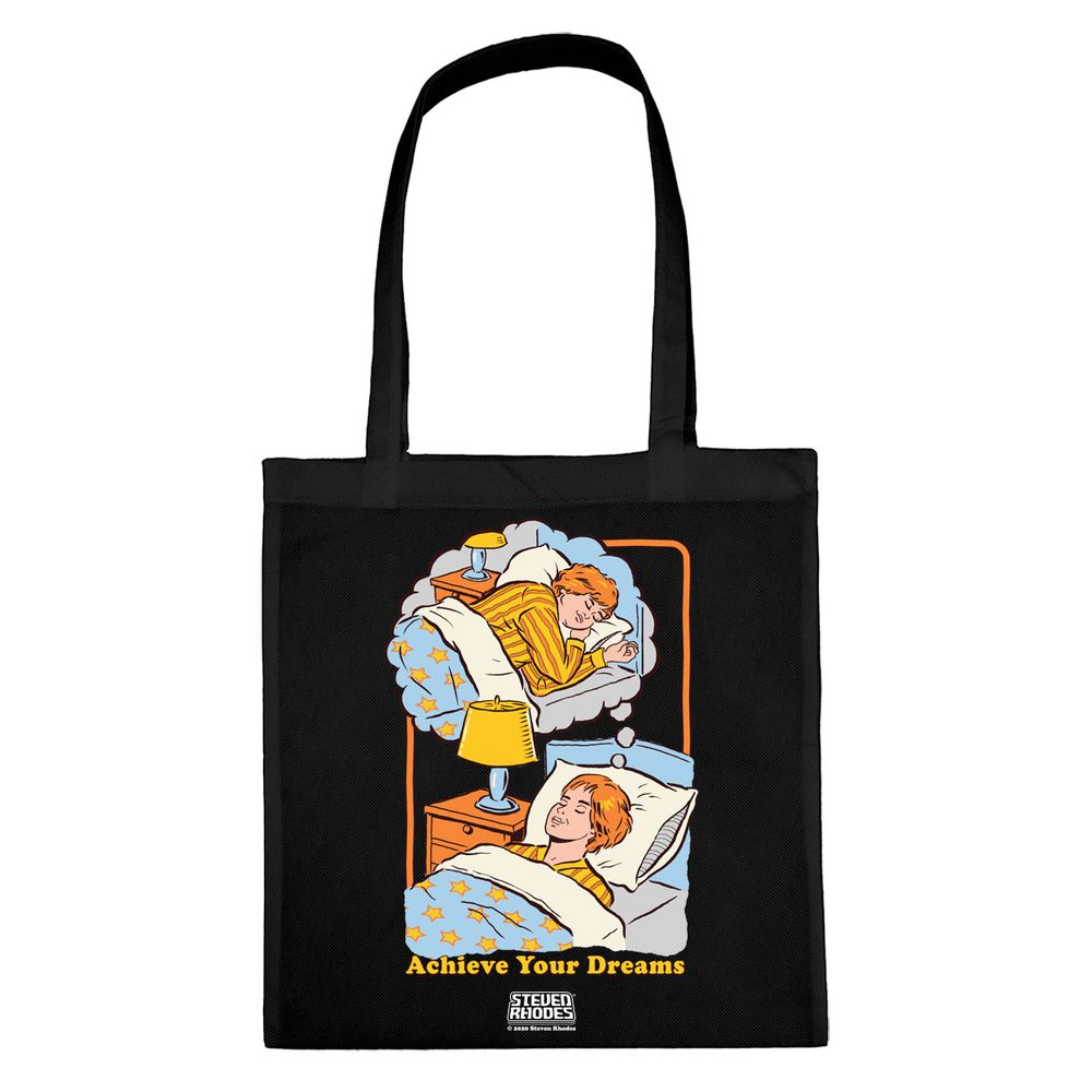 Die Tasche zeigt ein Kind, das auf dem Rücken liegt und davon träumt auf der Seite zu liegen. Außerdem sieht man den Text "Achieve Your Dreams".