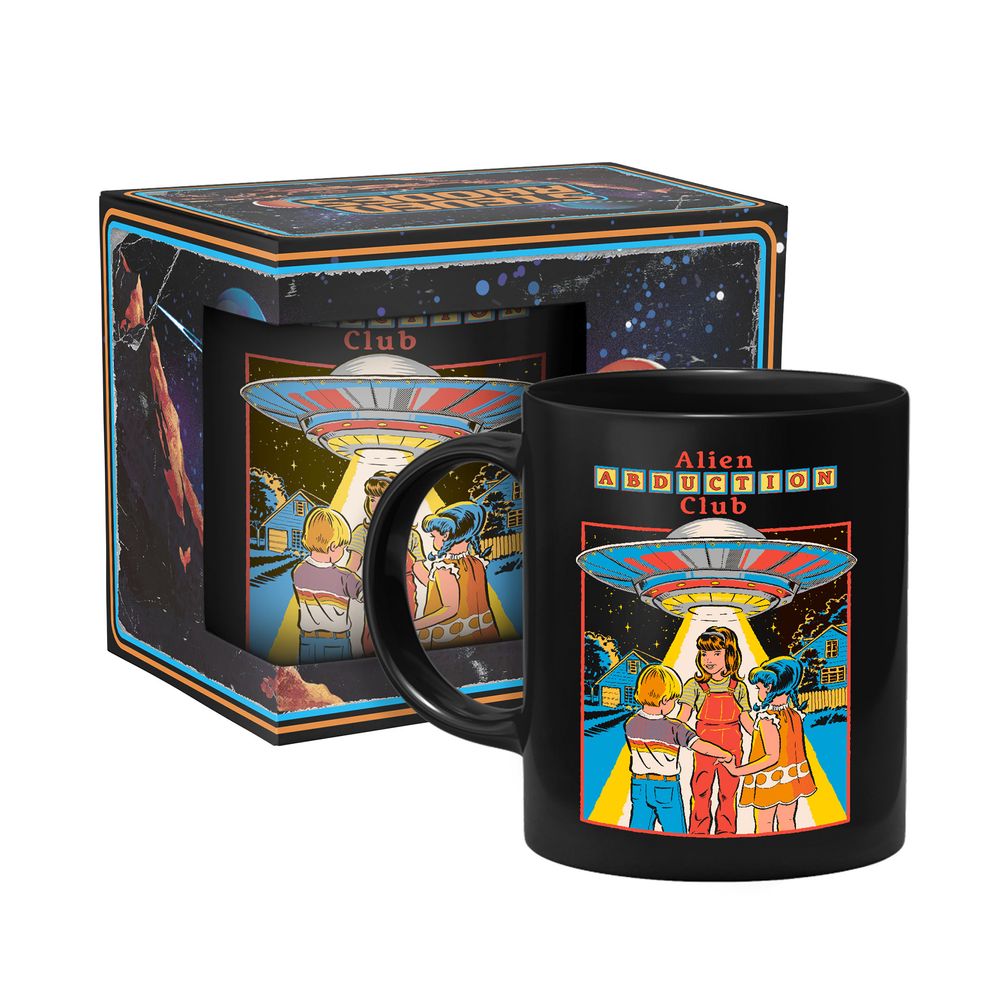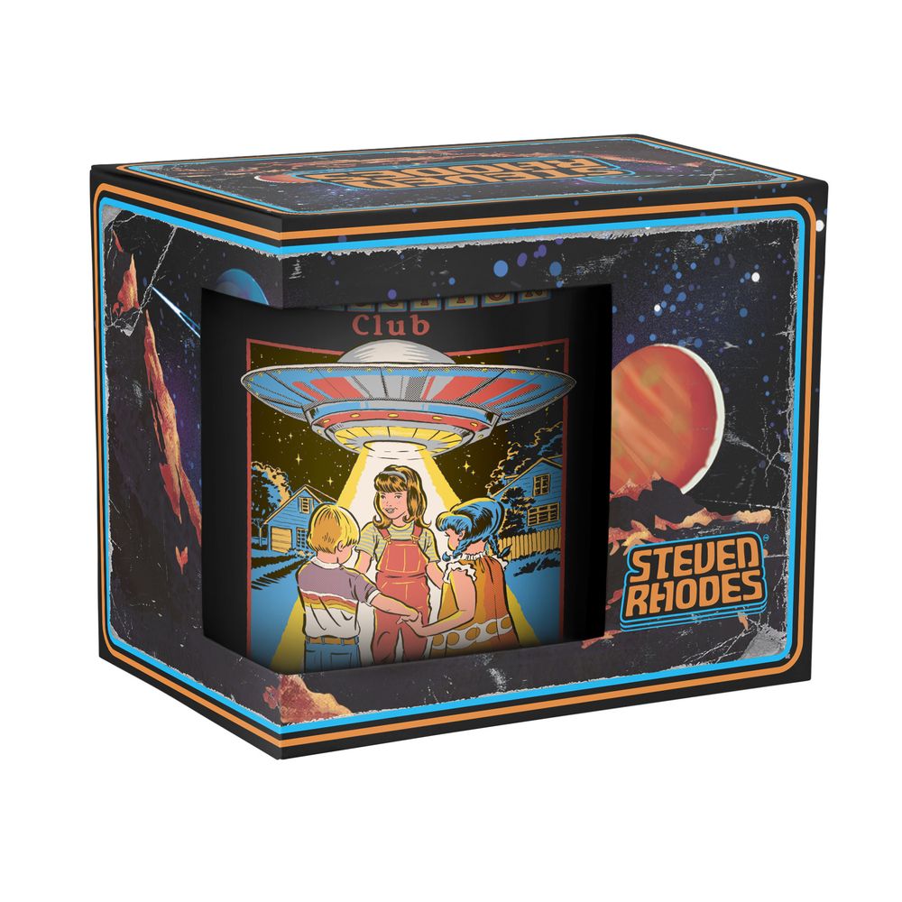 Die Tasse zeigt drei Kinder vor einem Ufo.