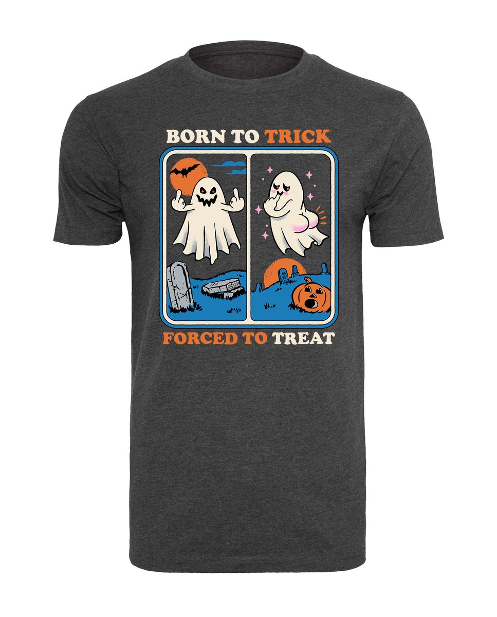 Das T-Shirt zeigt den Spruch "Born To Trick Forced To Treat" mit zwei Geistern.
