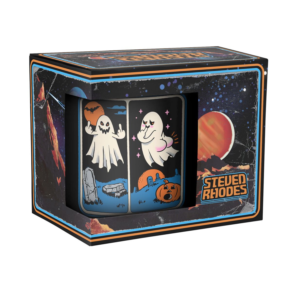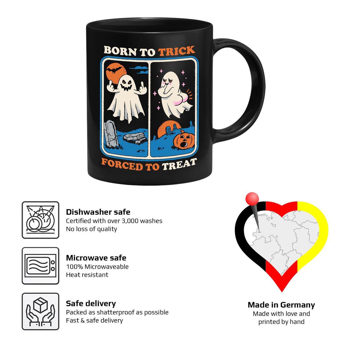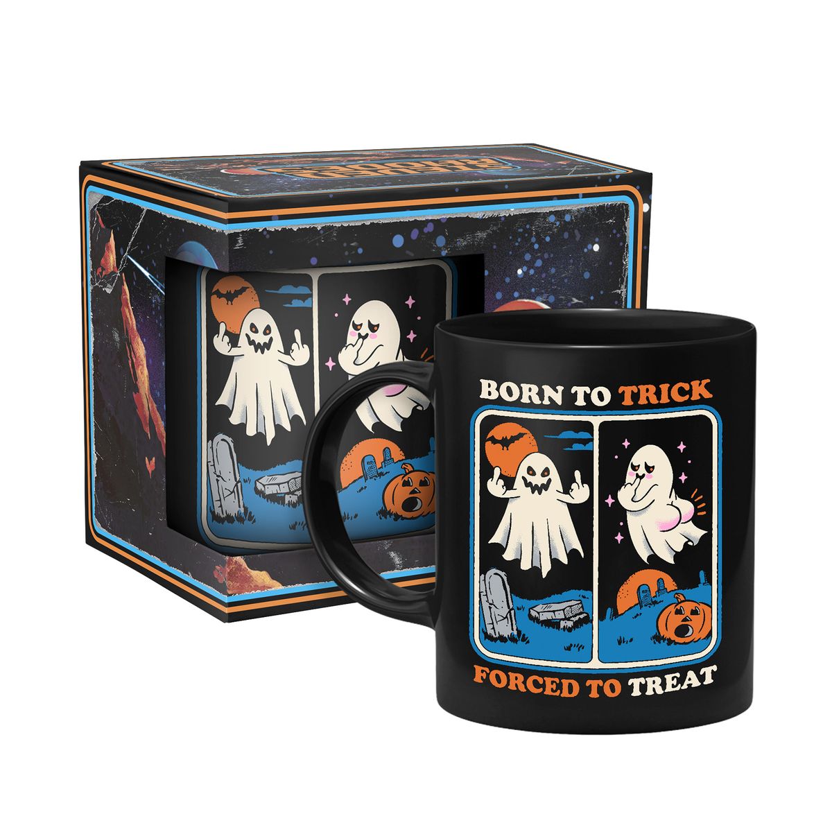 Die Tassezeigt den Spruch "Born To Trick Forced To Treat" mit zwei Geistern.