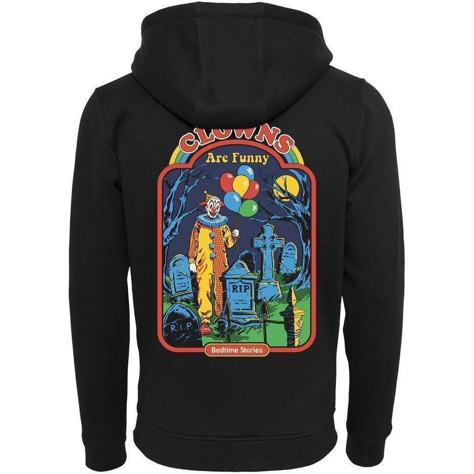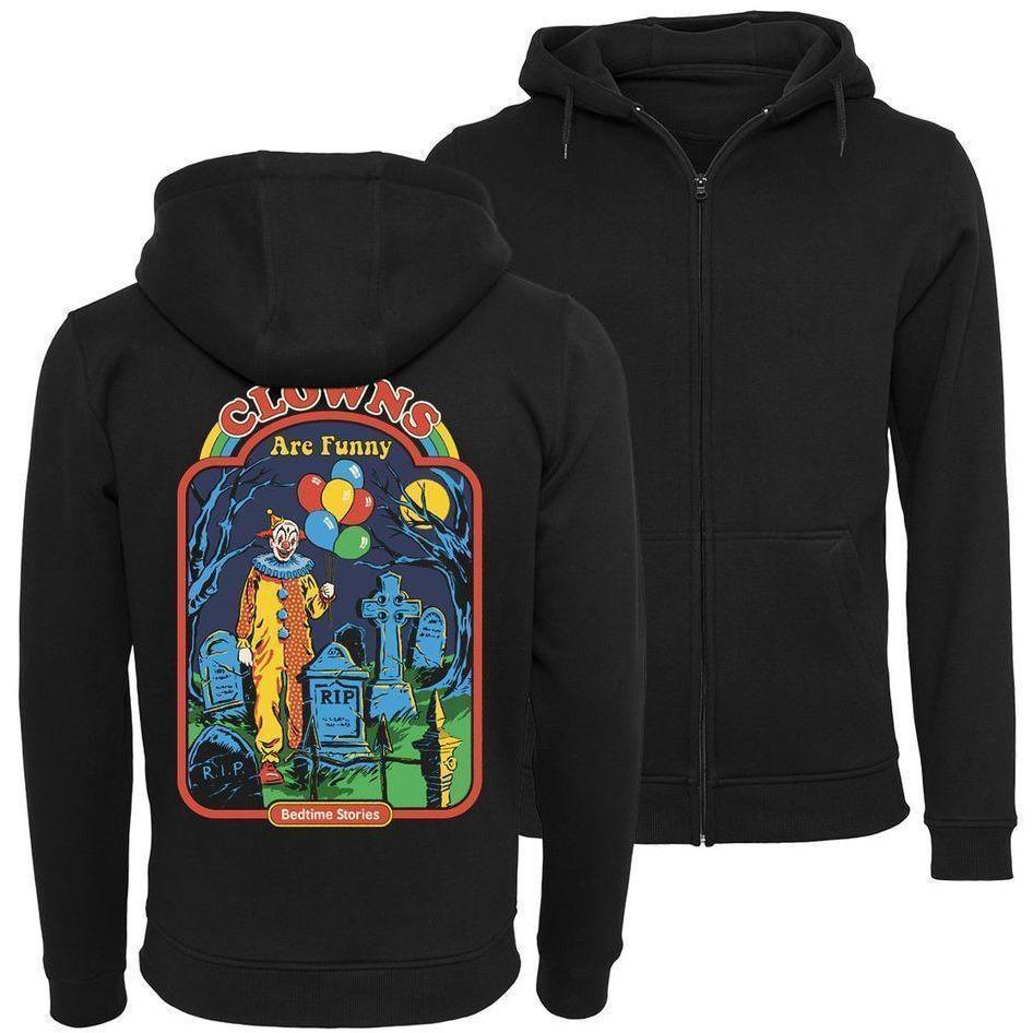 Der Zip-Hoodie zeigt einen Clown mit Ballons, der auf einem Friedhof steht und den Text "Clowns Are Funny".