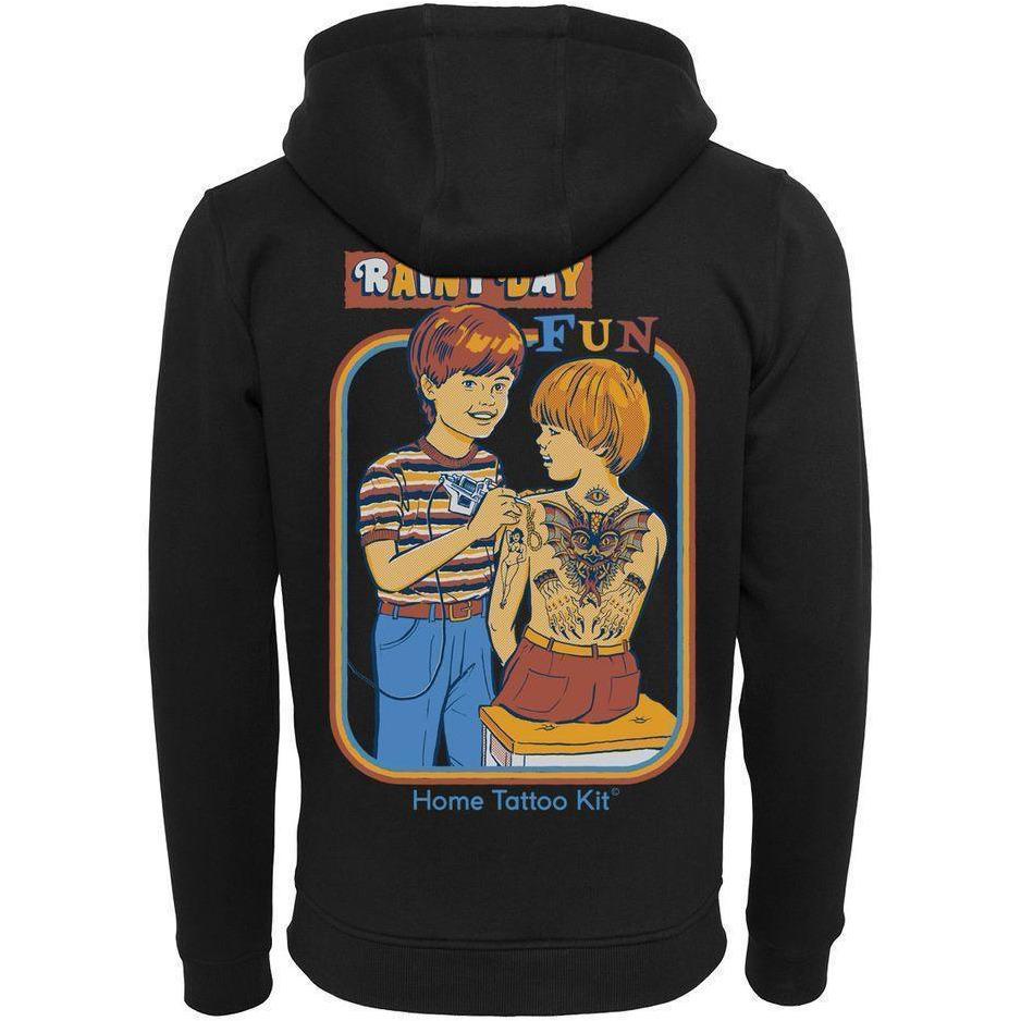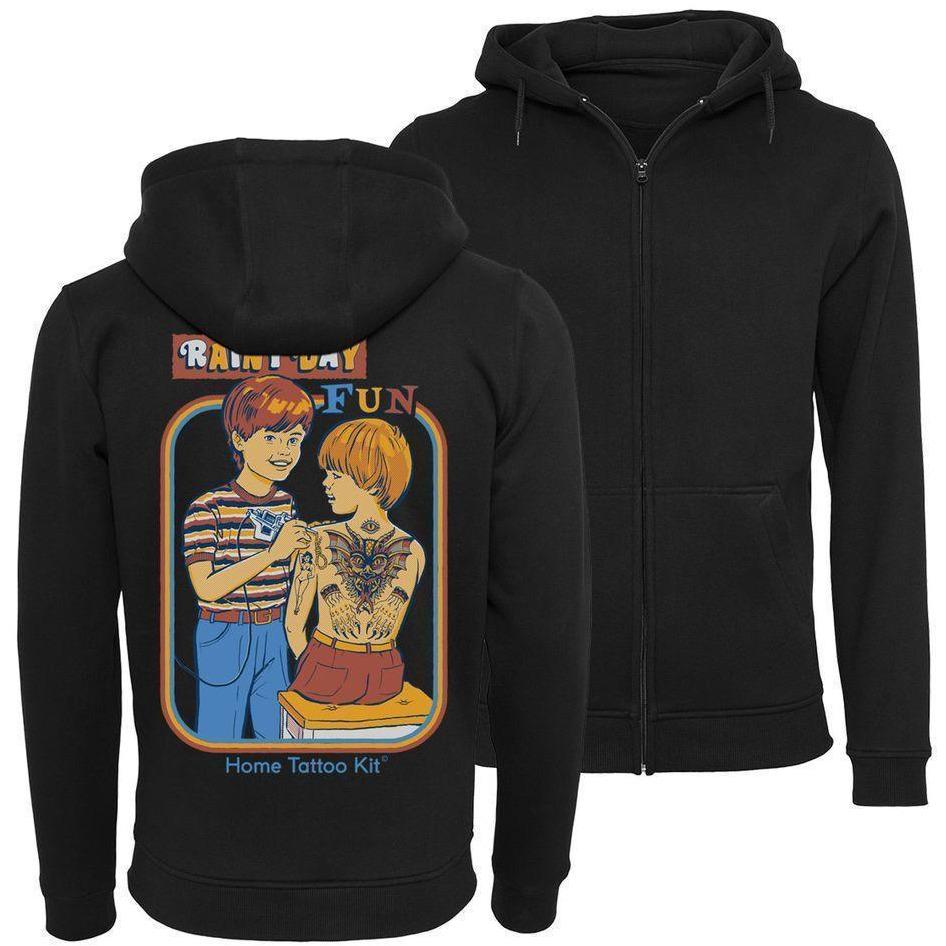 Der Zip-Hoodie zeigt einen Jungen, der einen anderen tättowiert und den Text "Rainy Day Fun".