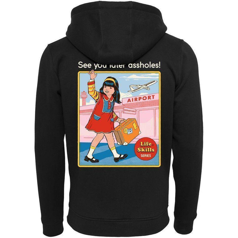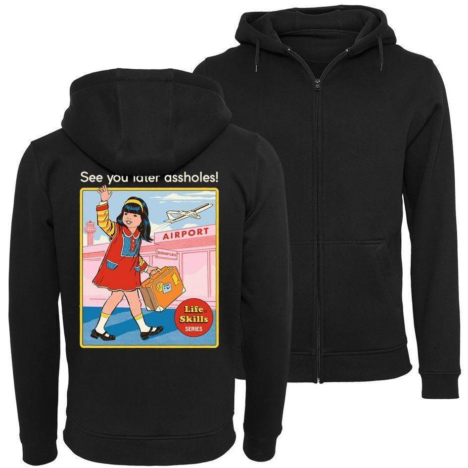 Der Zip-Hoodie zeigt ein Mädchen, das sich am Flughafen verabschiedet. Oben steht der Text "See you later assholes!“.