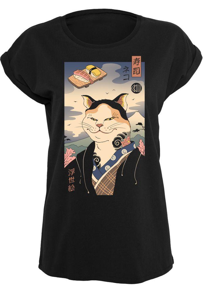 Das Shirt zeigt eine Katze mit Kimono, die tätowiert ist. Über ihr schwebt ein Brett mit Sushi.