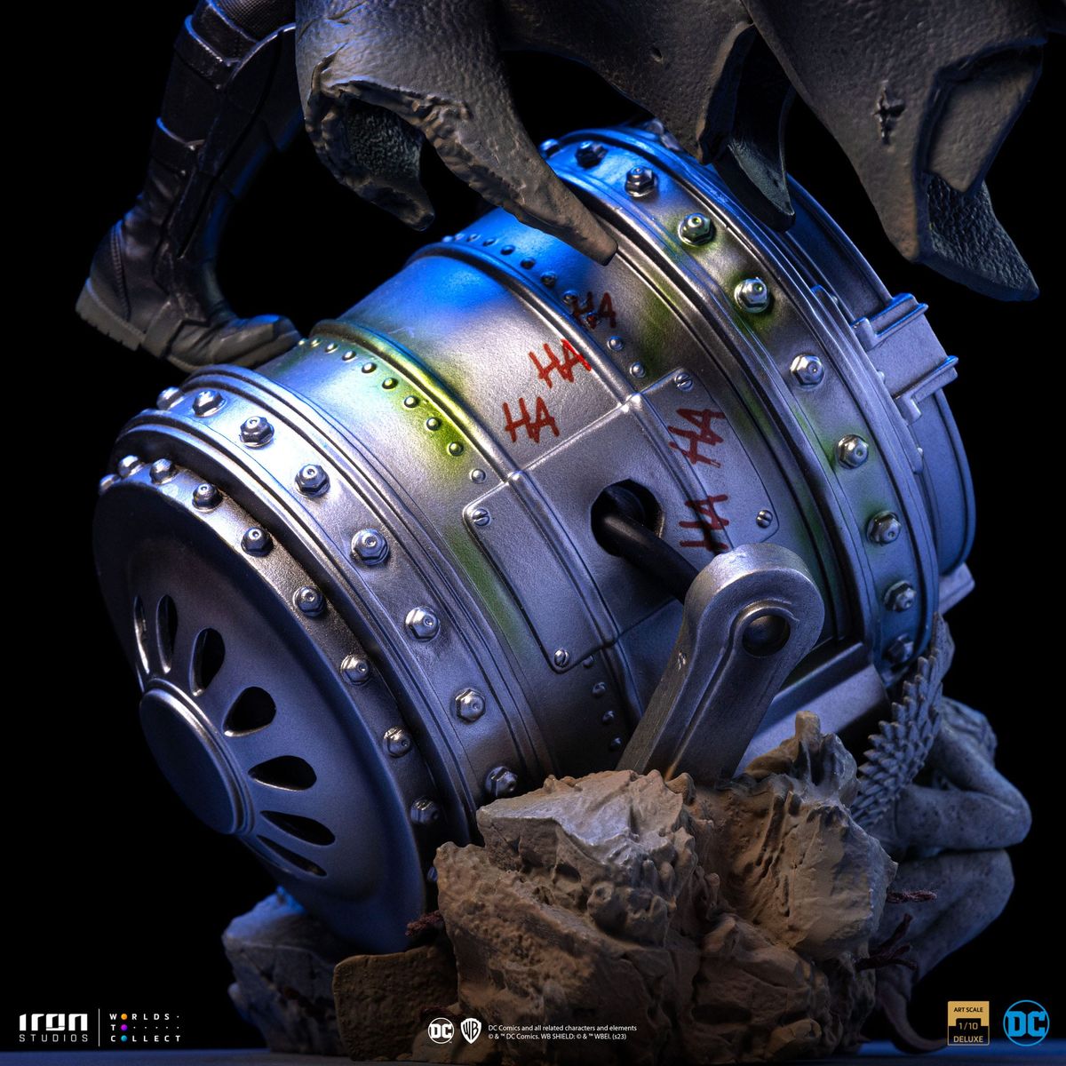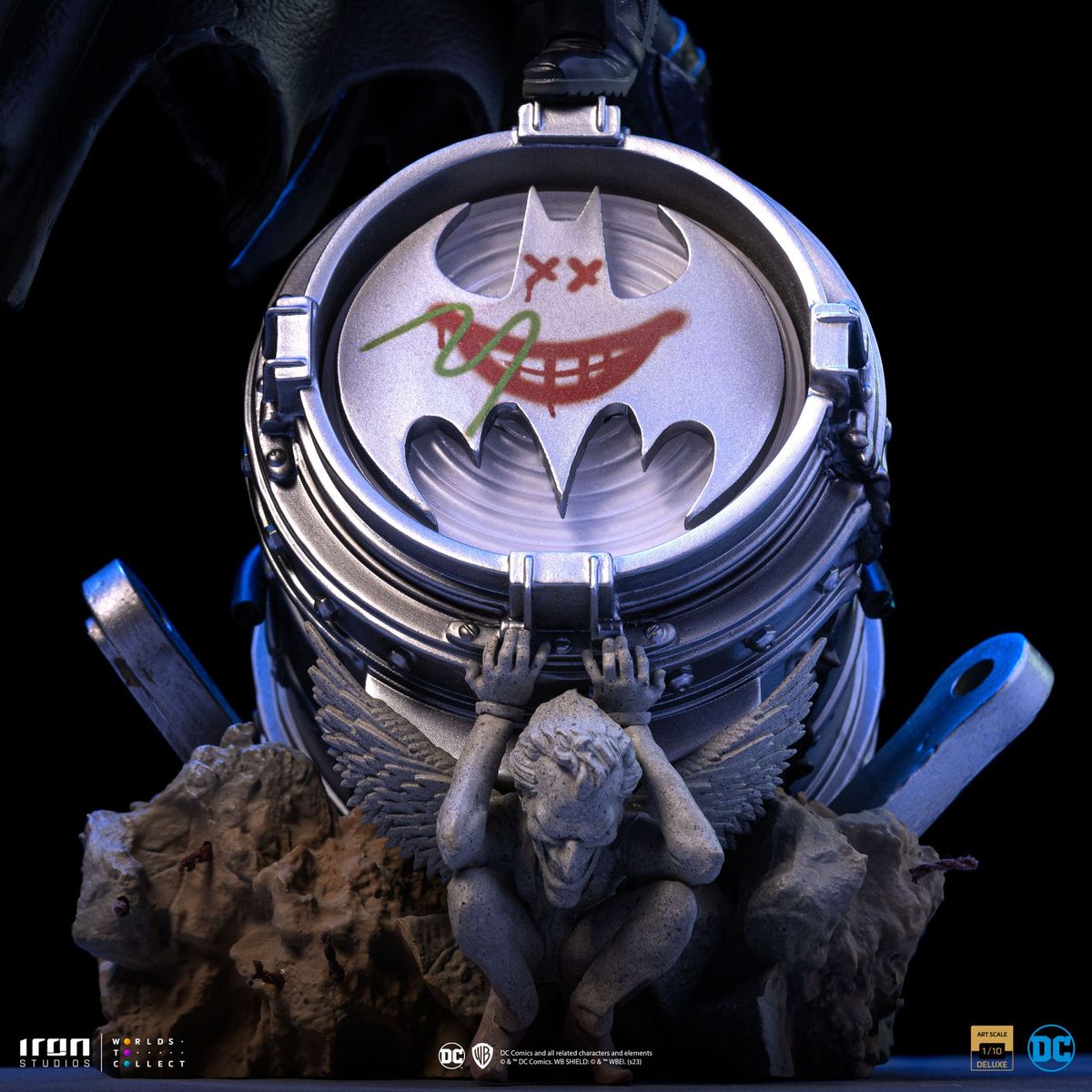 High-quality figure of Batman standing on the Batsignal defaced by the Joker.