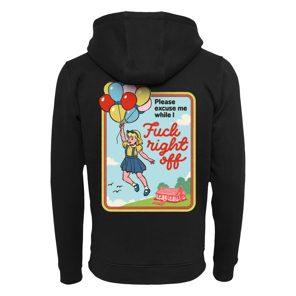 The hoodie shows a girl flying away with balloons. The words "Please excuse me while IF*ck right off" are written next to it.