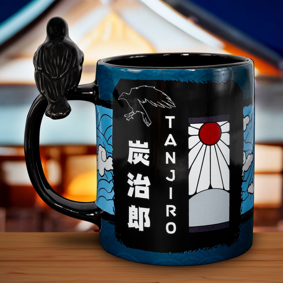 The cup shows Tanjiro's mask. A crow sits on the handle.
