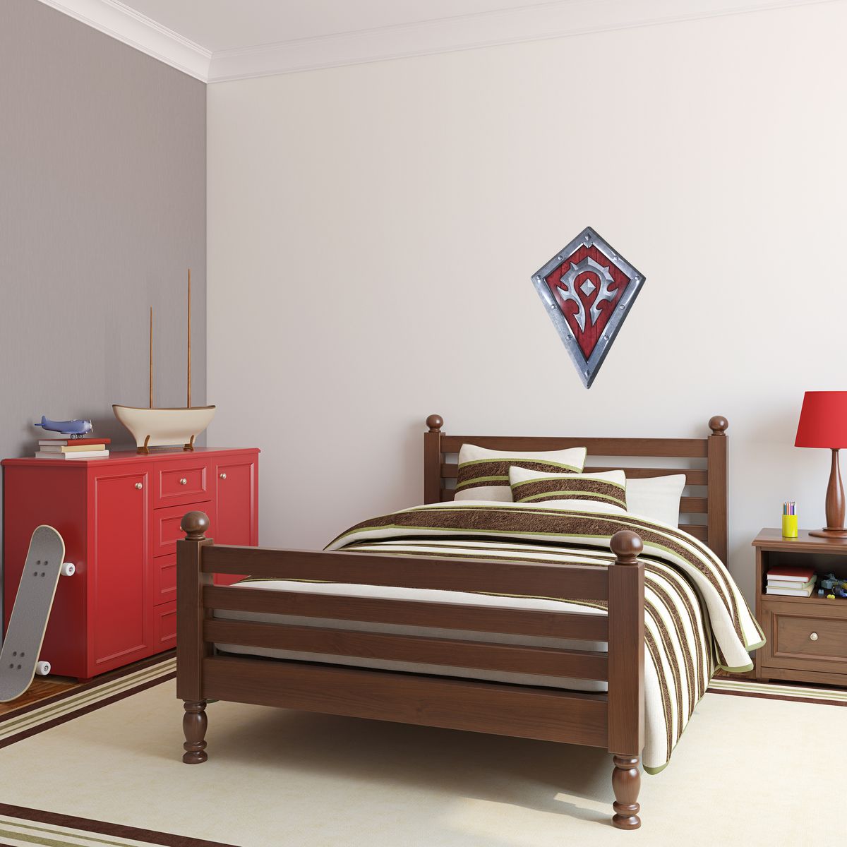 The shield comes in the shape of the Horde logo.