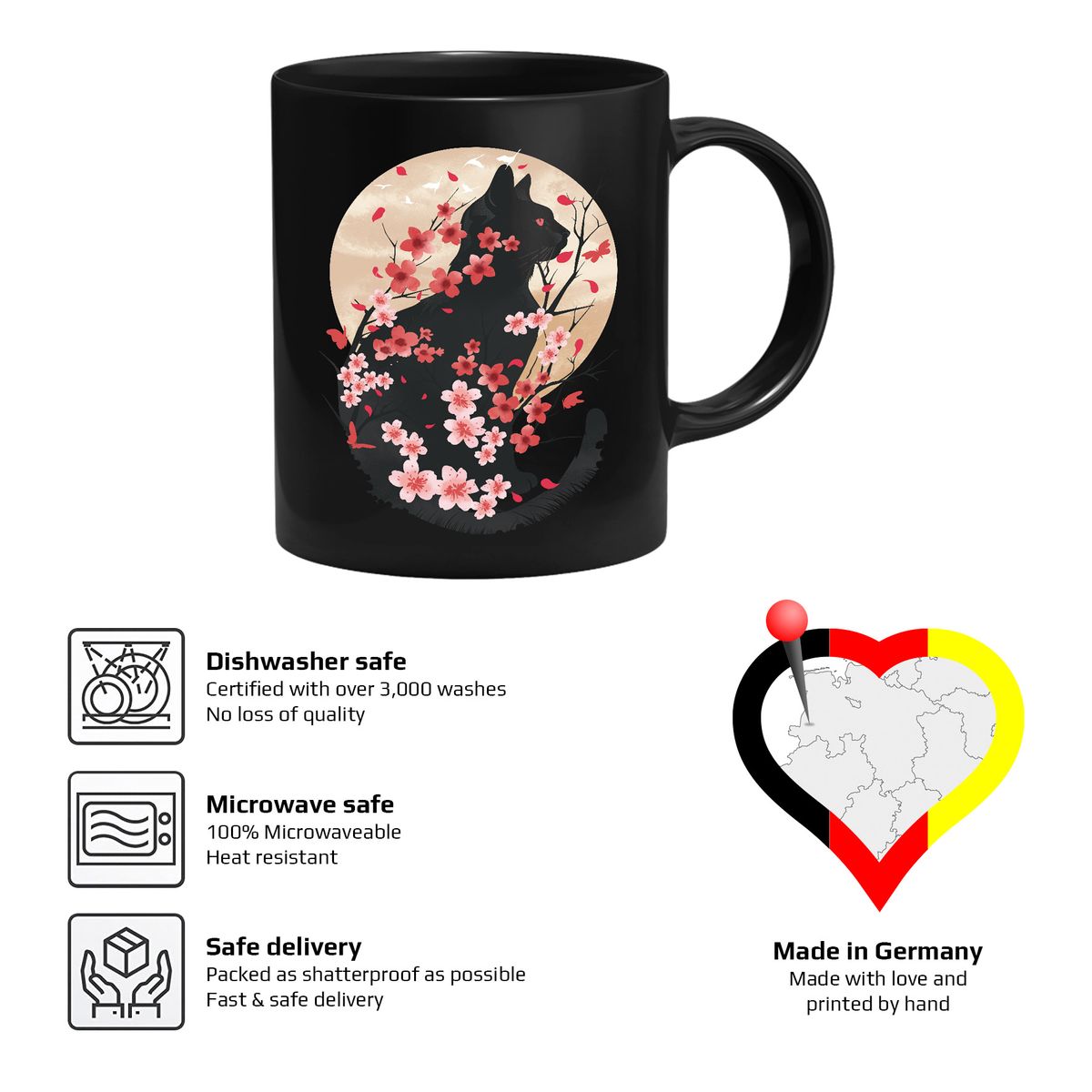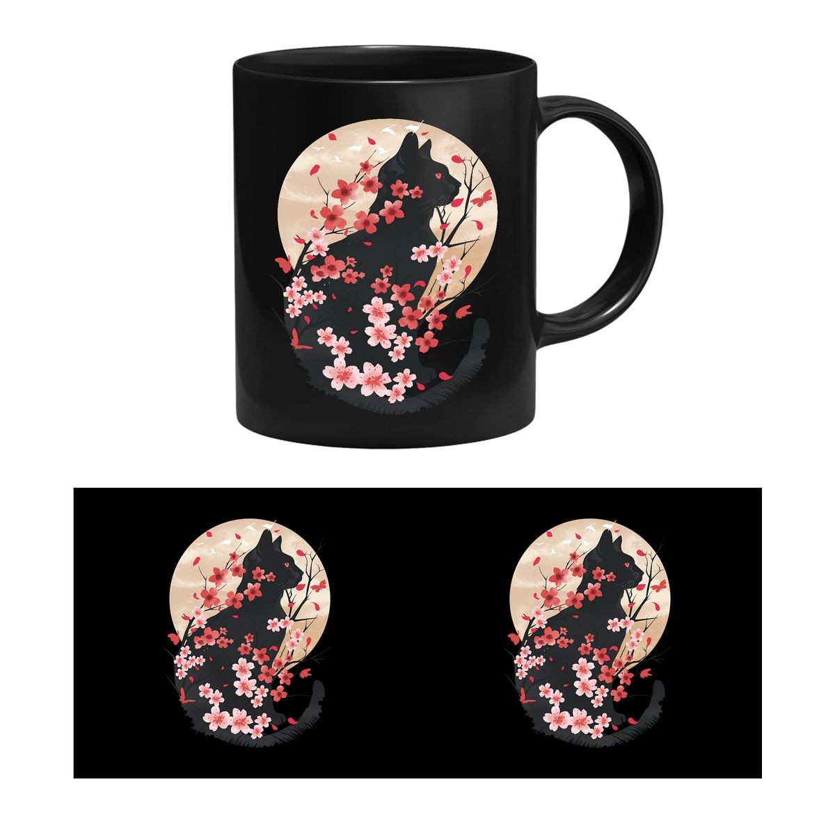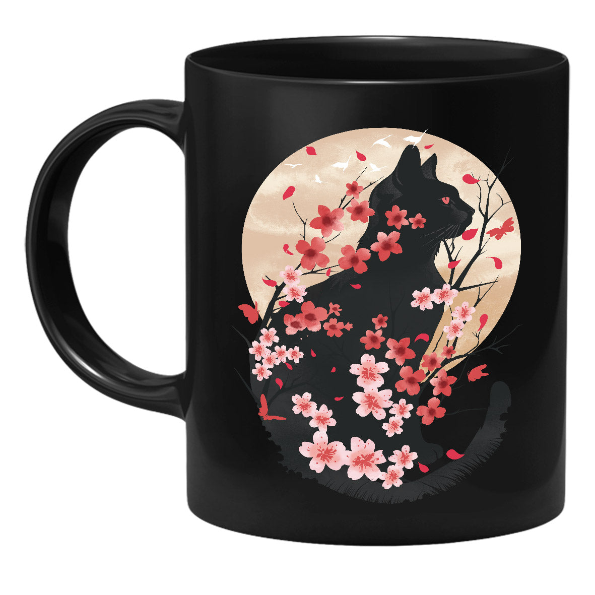 Die Tasse zeigt das Profil einer Katze hinter Kirschblüten.