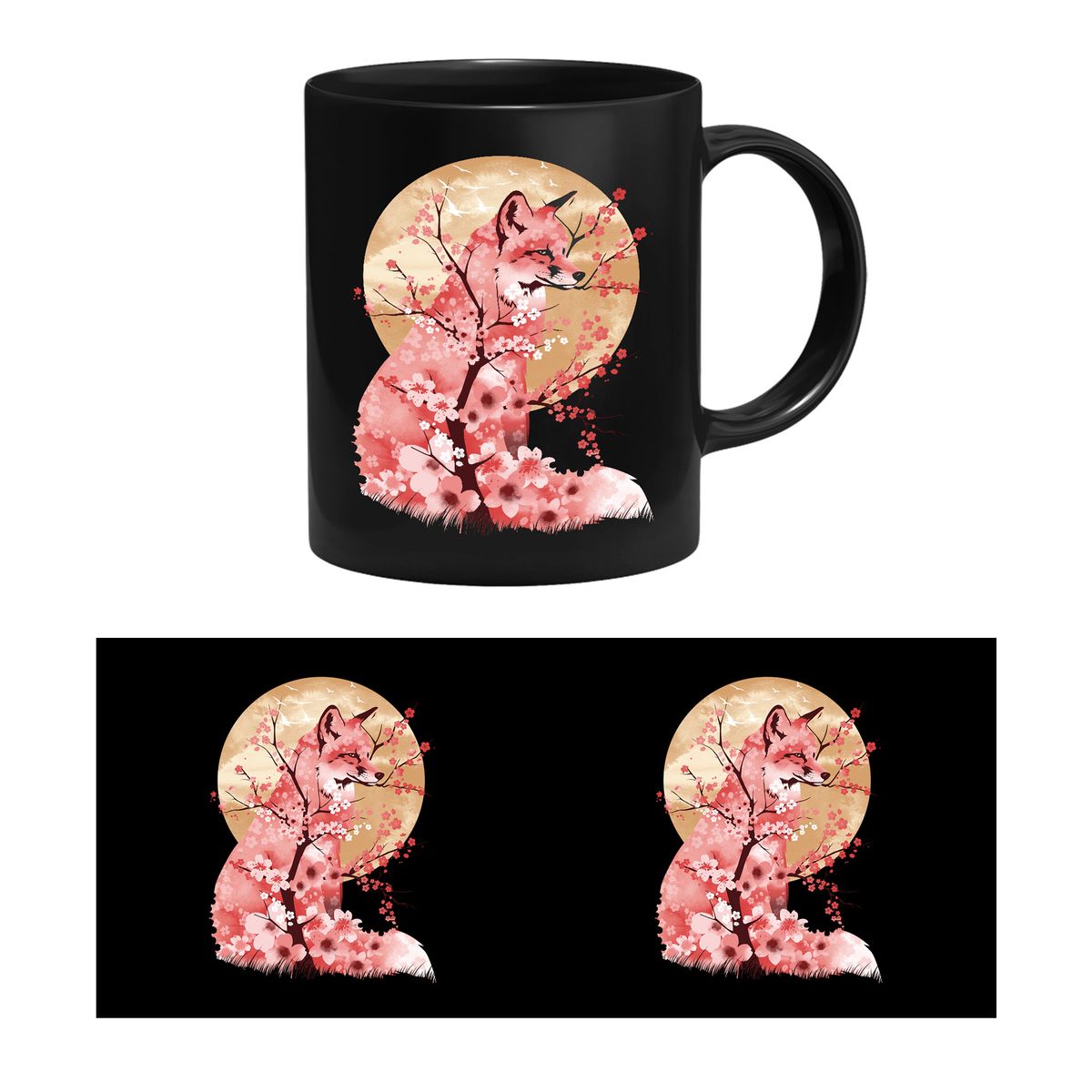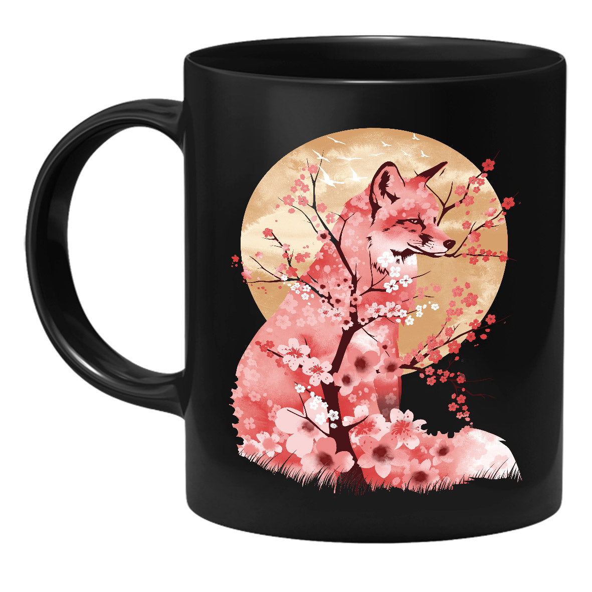 Die Tasse zeigt einen Fuchs mit Kirschblüten.