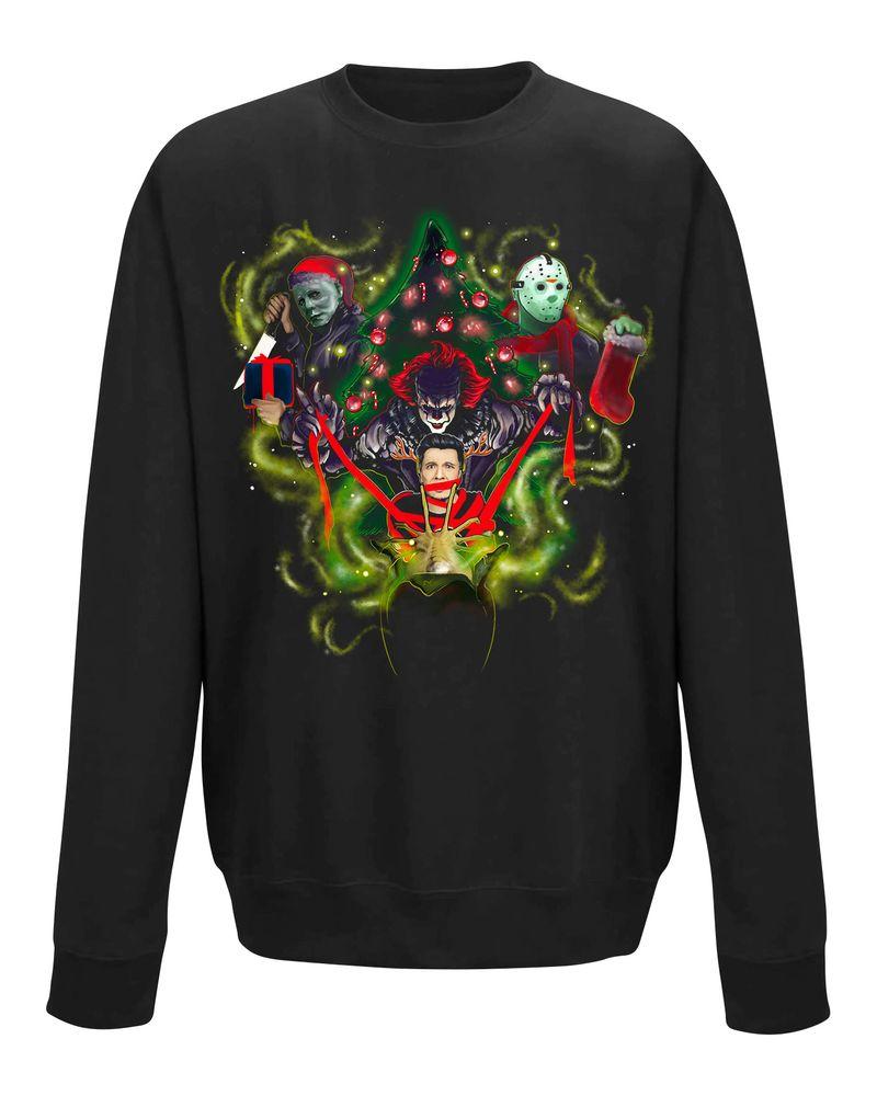 Das Sweatshirt zeigt den Heider umgeben von Michael Myers, Jason Voorhees und Pennywise.