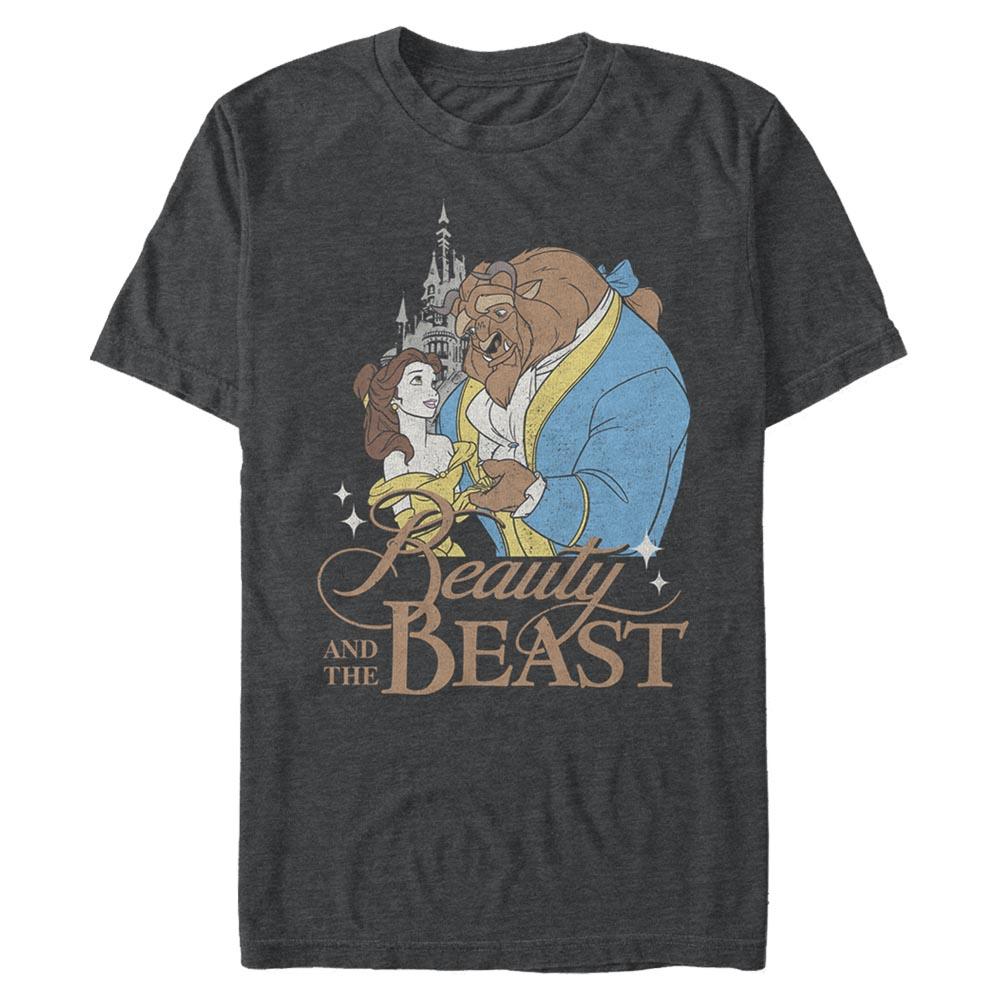 Das T-Shirt zeigt Belle und das Biest beim Tanzen. Im Hintergrund erkennt man das Schloss.