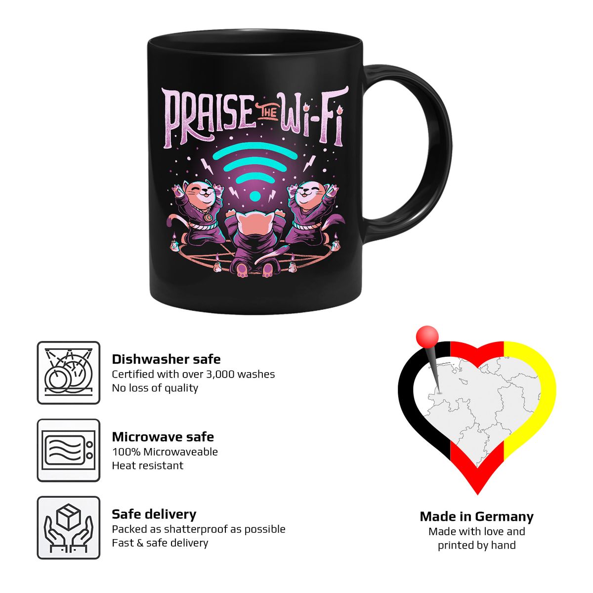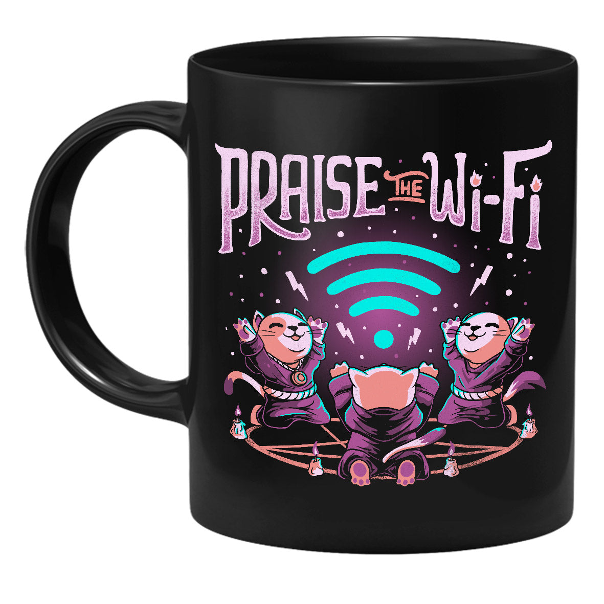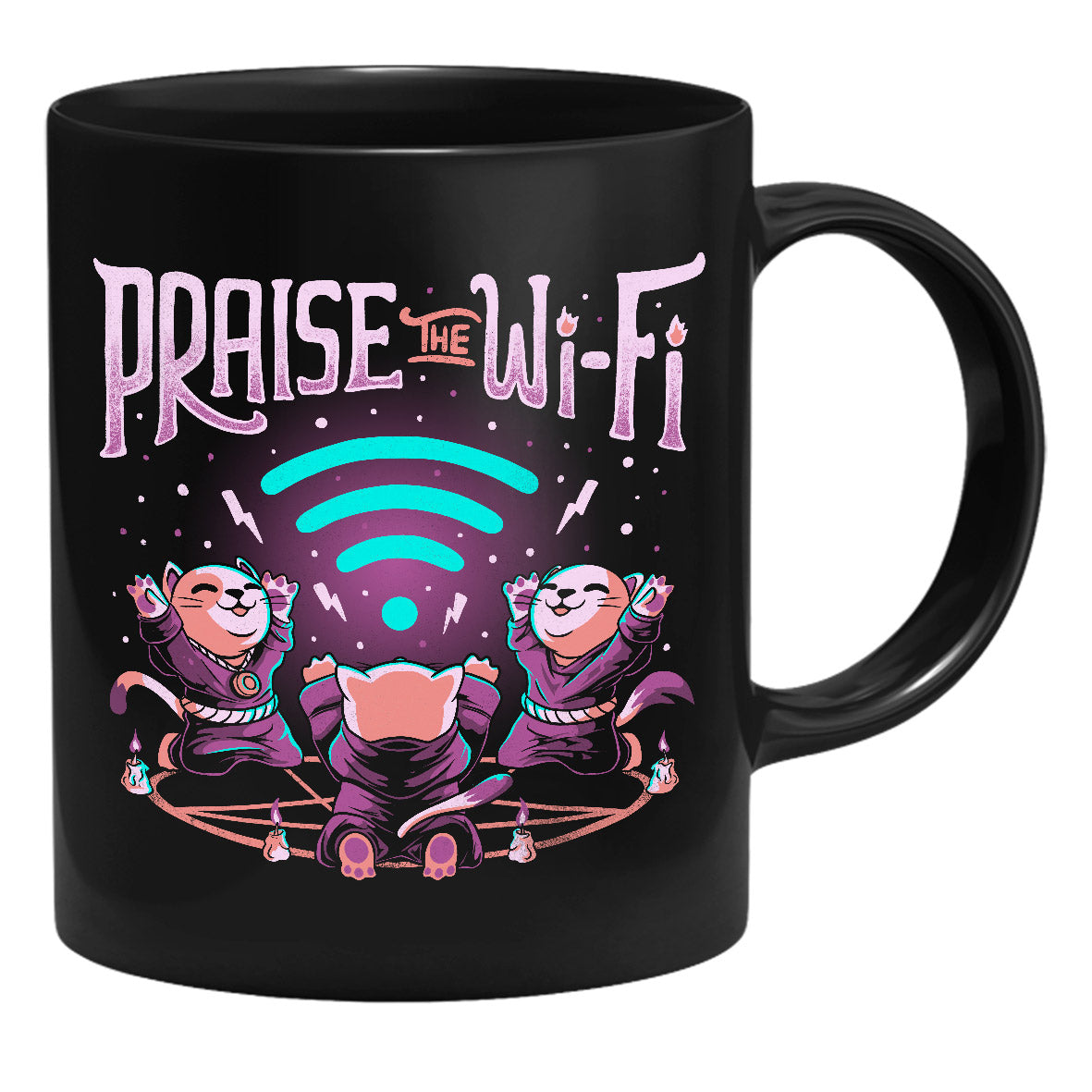 Die Tasse zeigt drei Katzen, die das Wi-Fi Symbol anbeten.