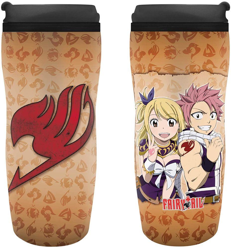 Thermobecher mit dem Logo von Fairy Tail. Auf der anderen Seite sieht man Lucy und Natsu.