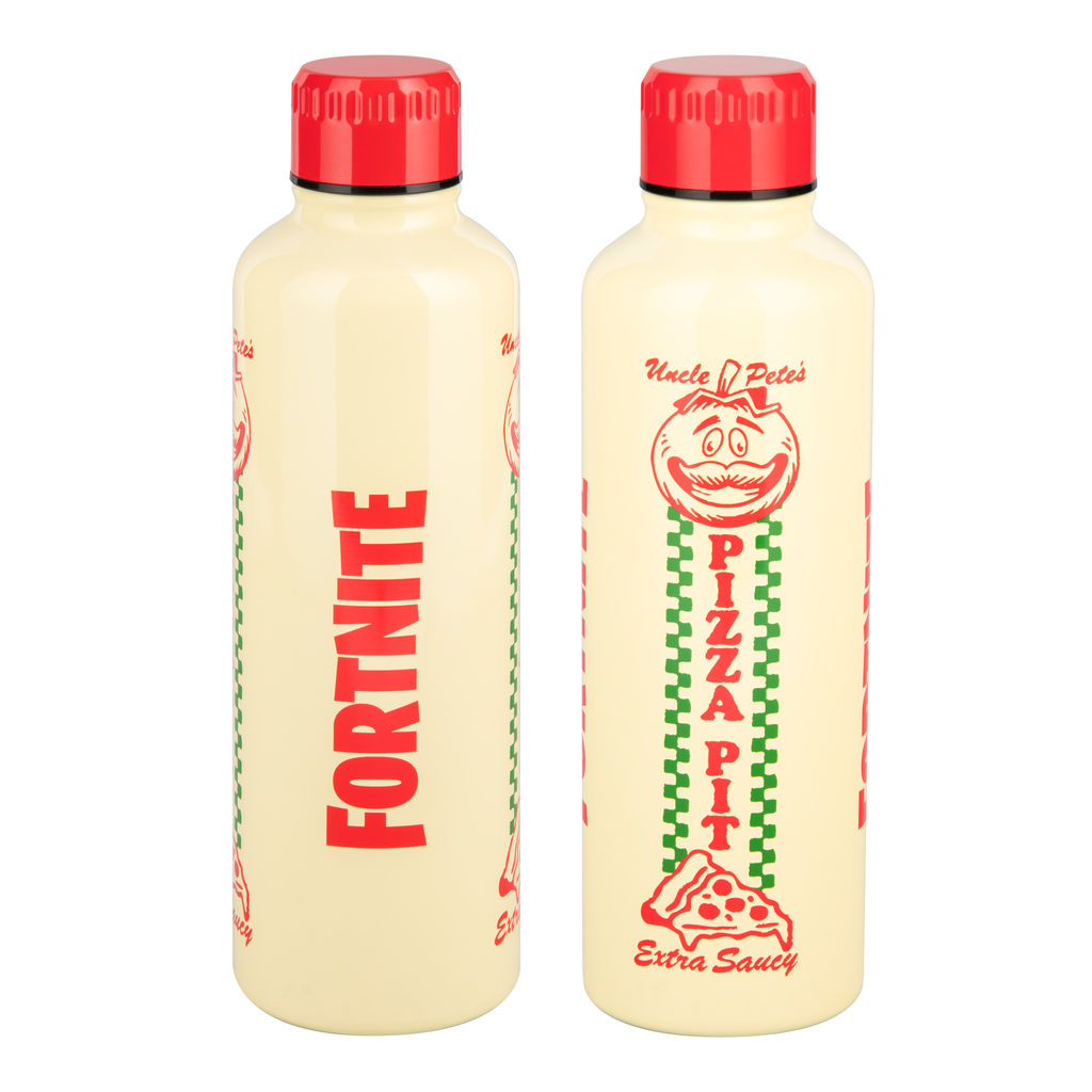 Die Trinkflasche zeigt das Fortnite Logo, sowie das Logo von Uncle Pete's Pizza Pit.
