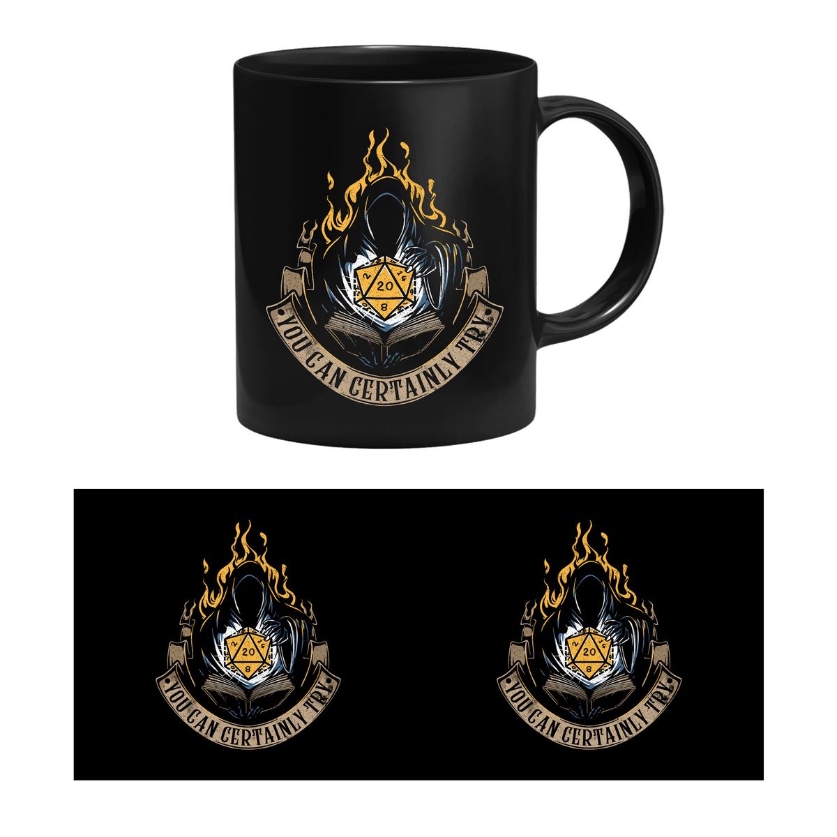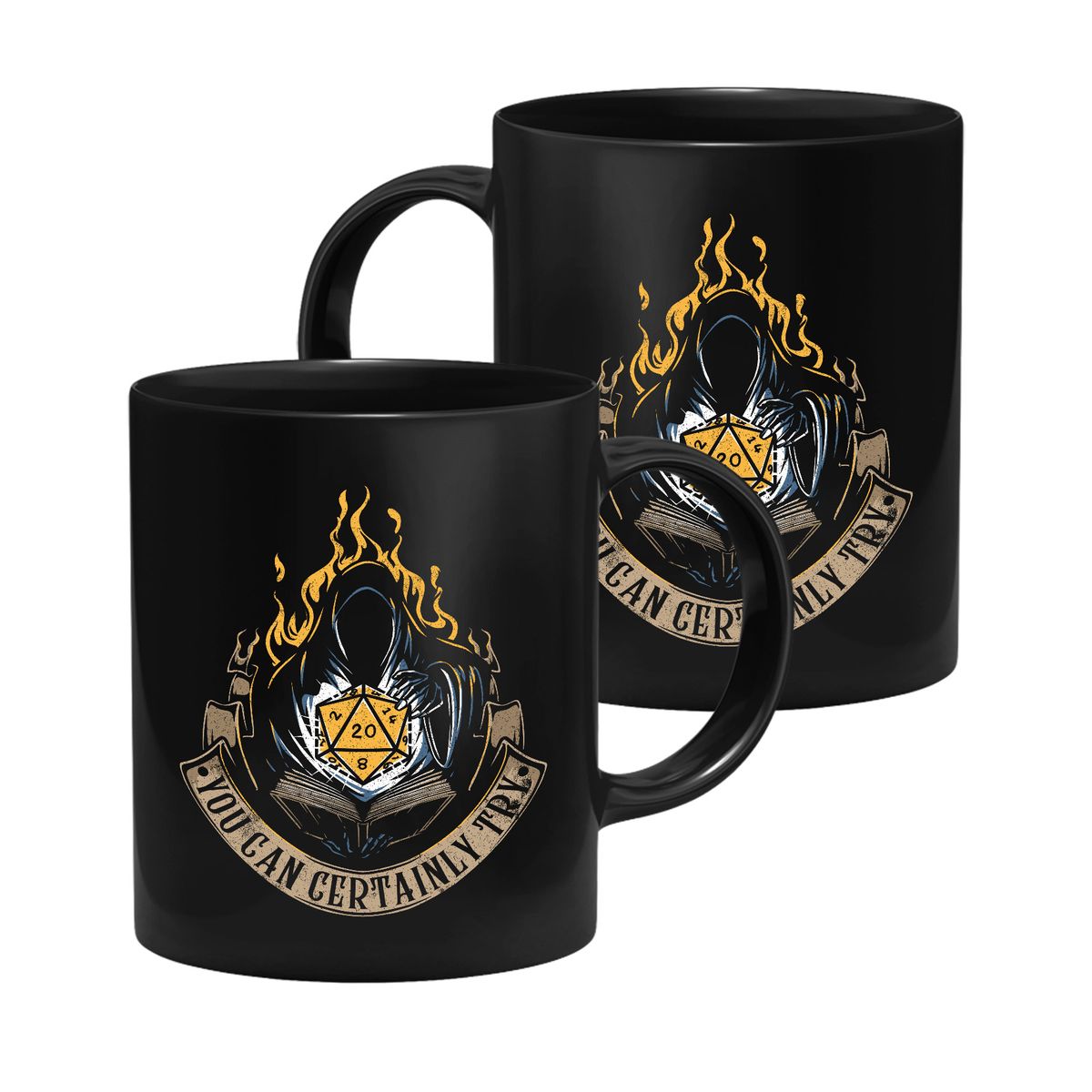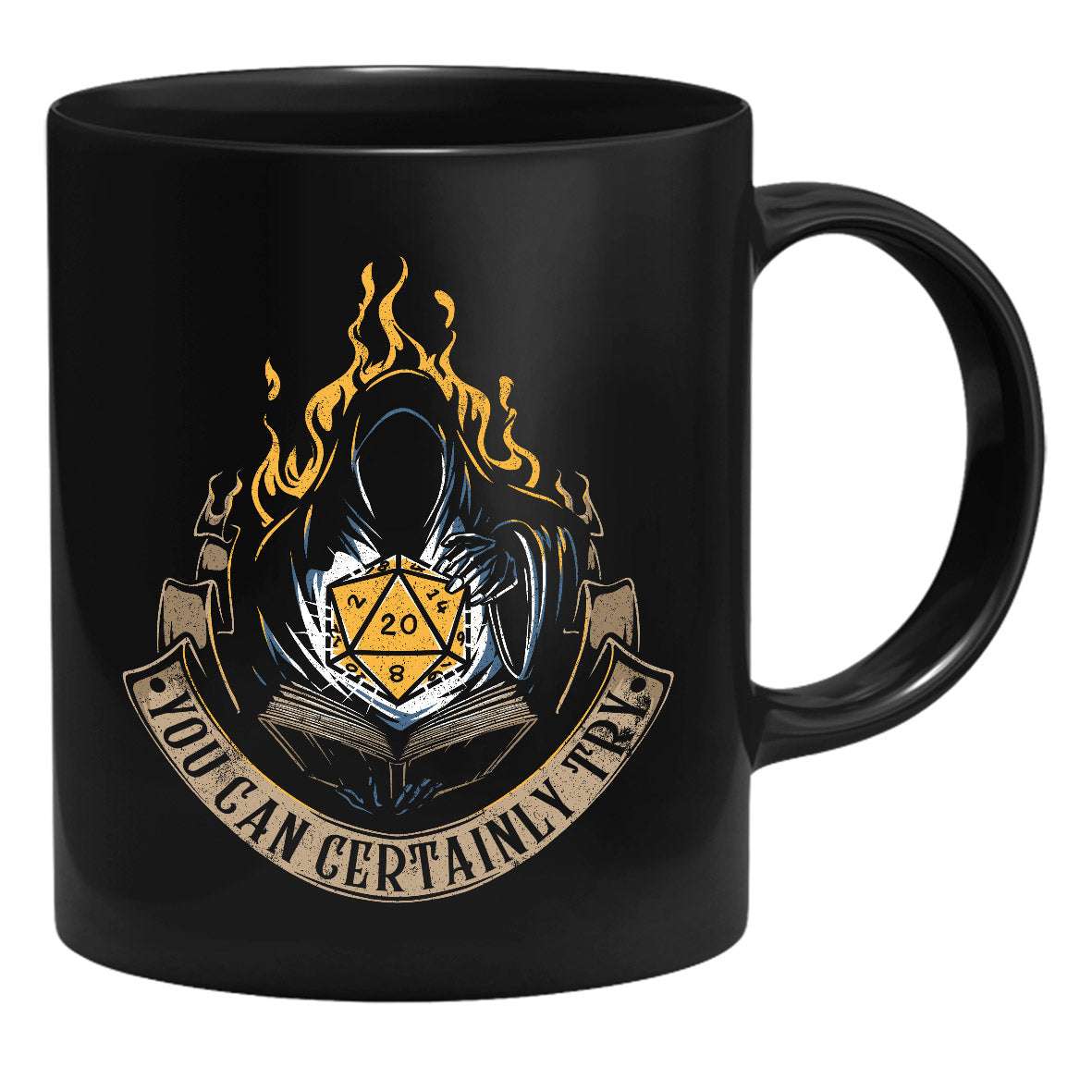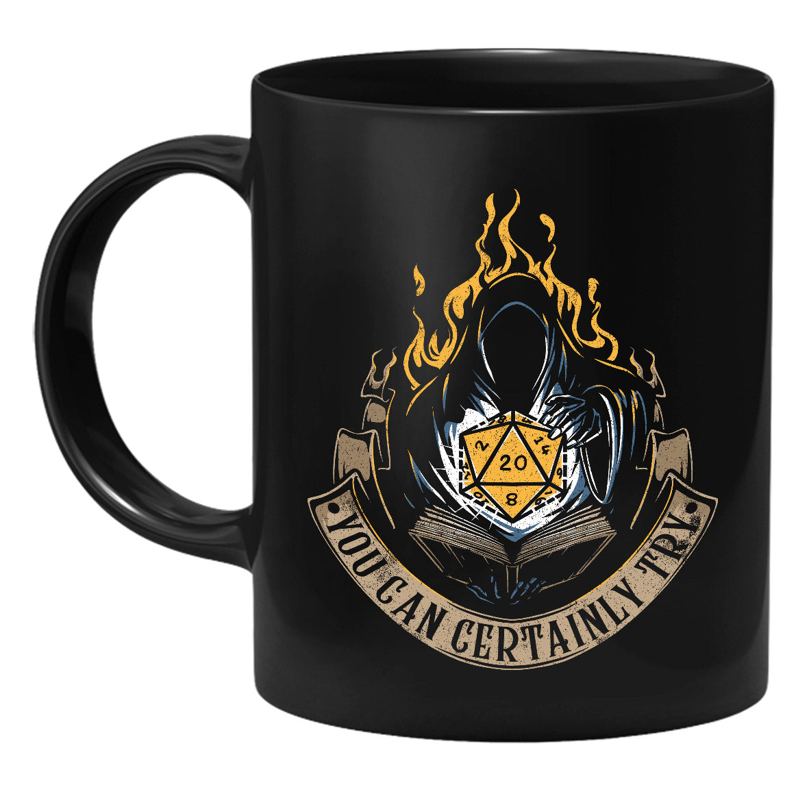 Die Tasse zeigt eine verhüllte Gestalt mit einem W20 und dem Spruch "You Can Certainly Try".