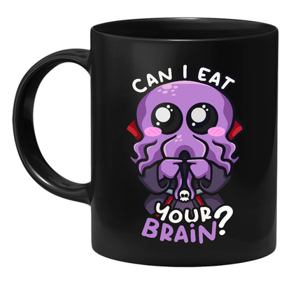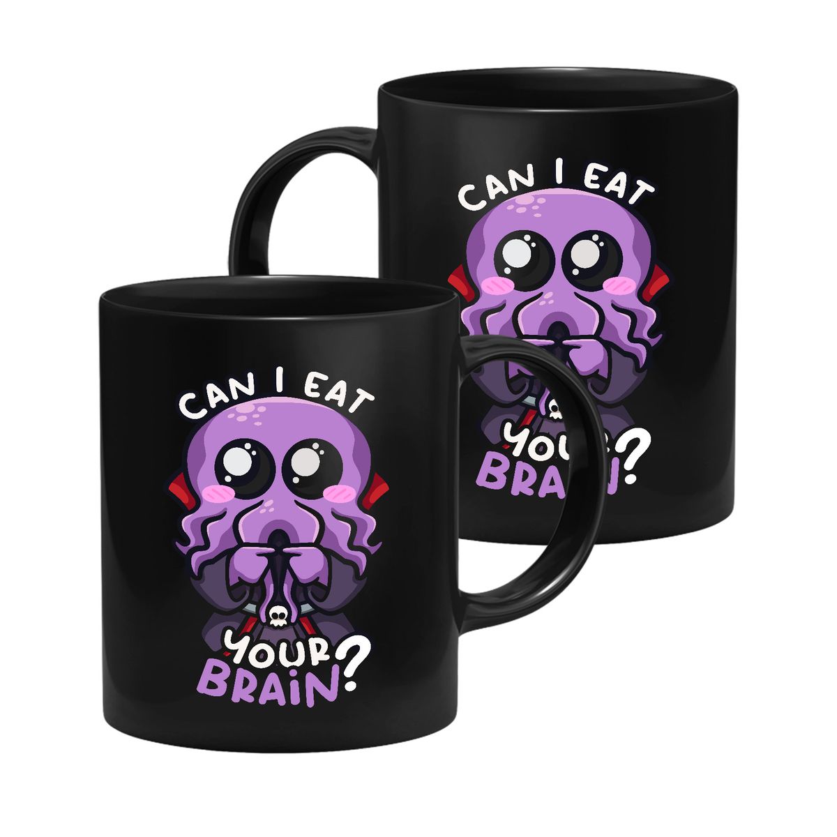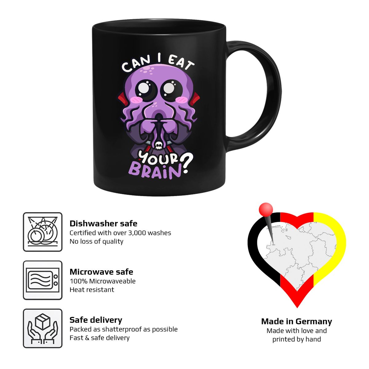 Die Tasse zeigt einen cuten Mindflayer mit der Frage "Can I Eat Your Brain?".