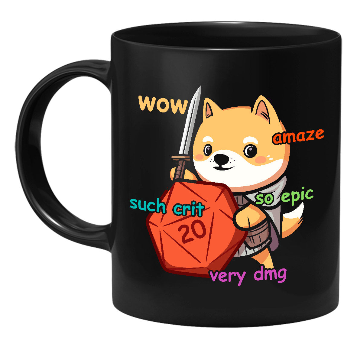 Die Tasse zeigt einen Abenteurer Hund mit einem W20.