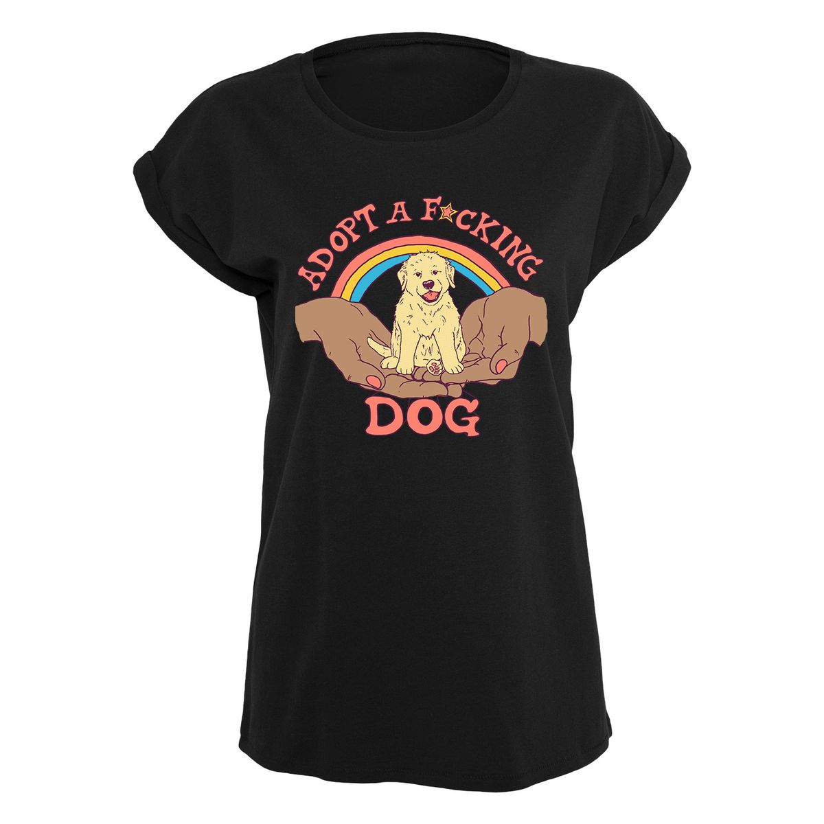 Das Shirt zeigt zwei Hände, die einen Welpen halten. Darüber steht "Adopt a F*cking Dog".
