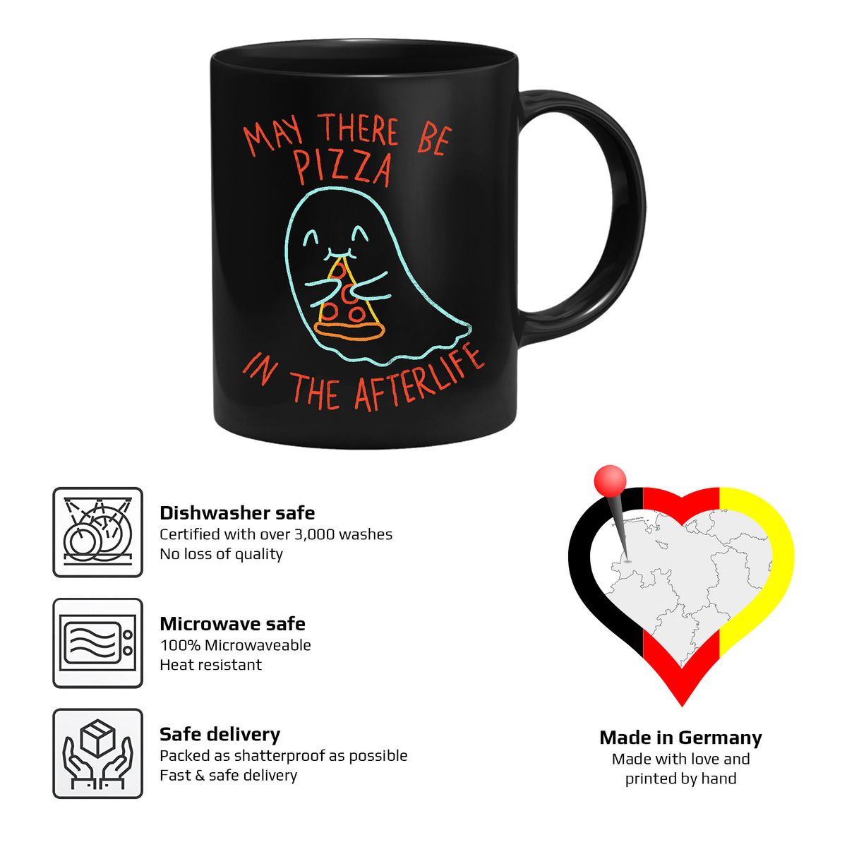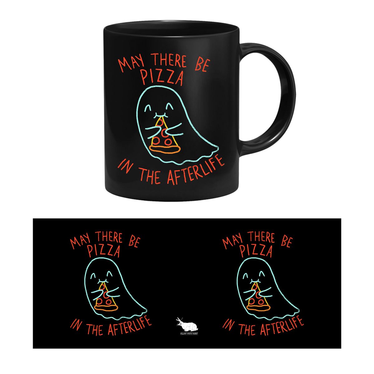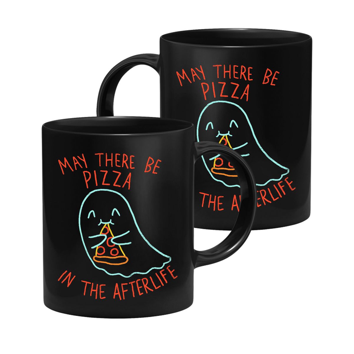 Die Tasse zeigt einen kleinen Geist mit einem Stück Pizza und dem Spruch "May There Be Pizza In The Afterlife".