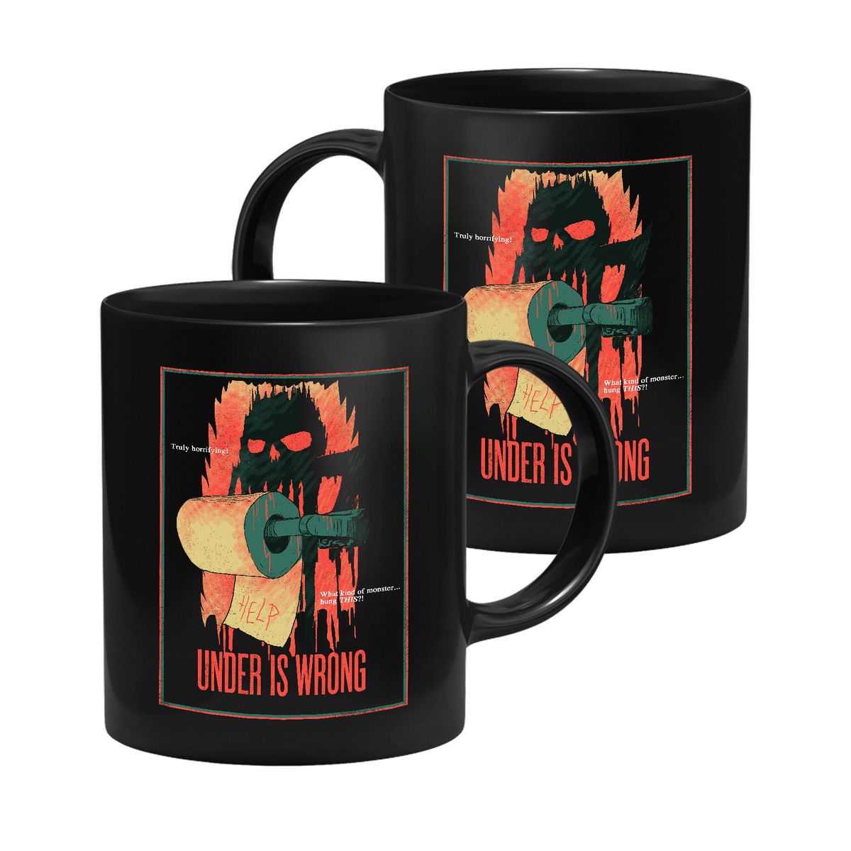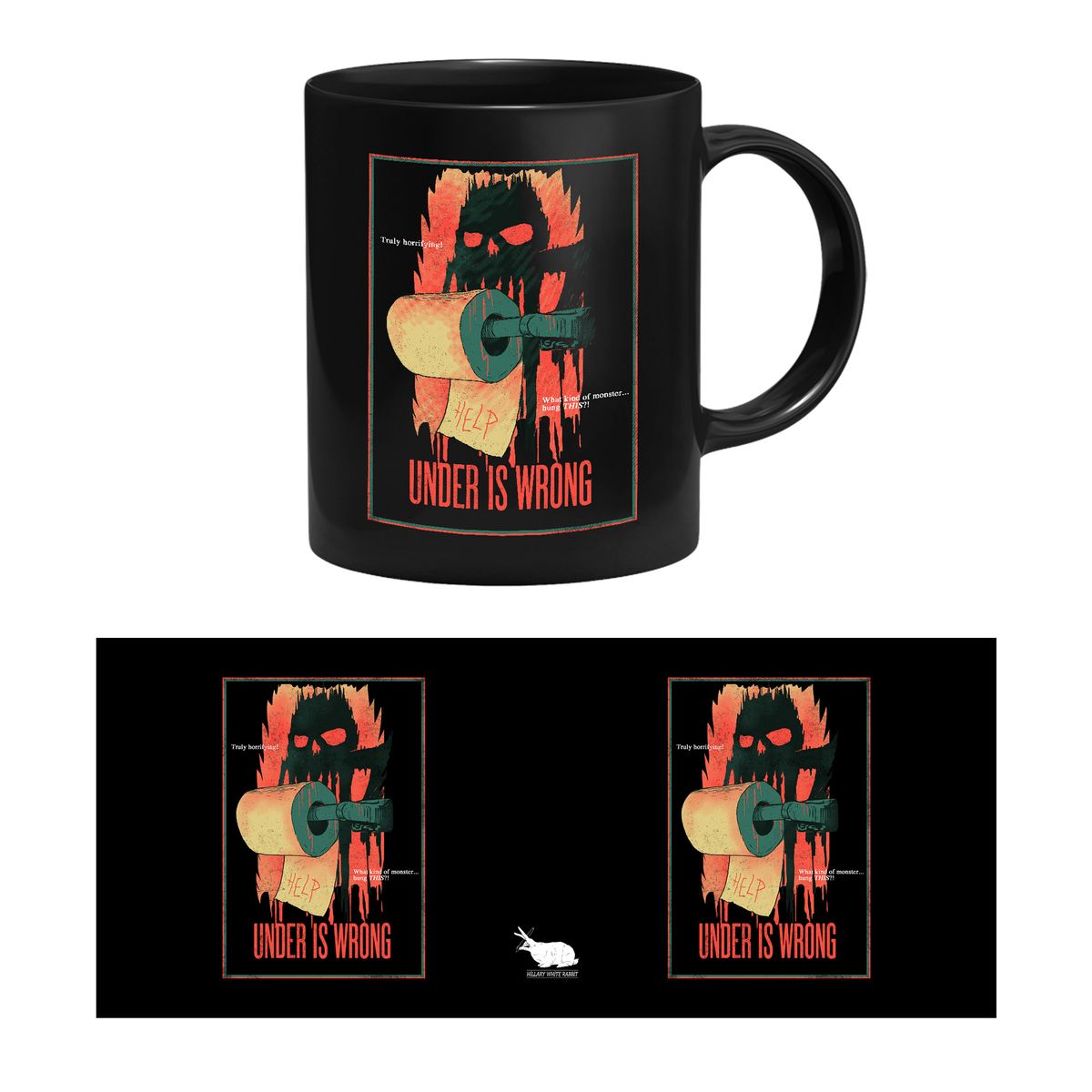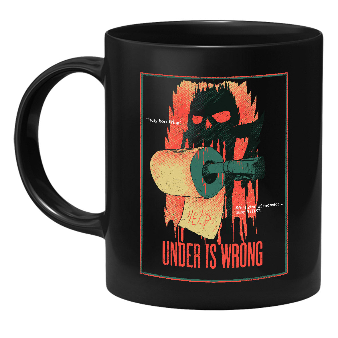 Die Tasse zeigt eine Klorolle, die falsch herum aufgehangen wurde.