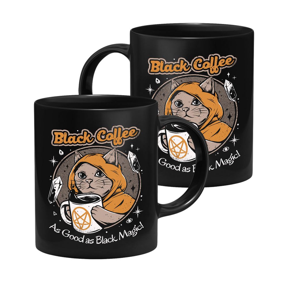 Die Tasse zeigt eine Katze mit Kapuze und Kaffeetasse. Außerdem liest man den Spruch Black Coffee As Good as Black Magic!