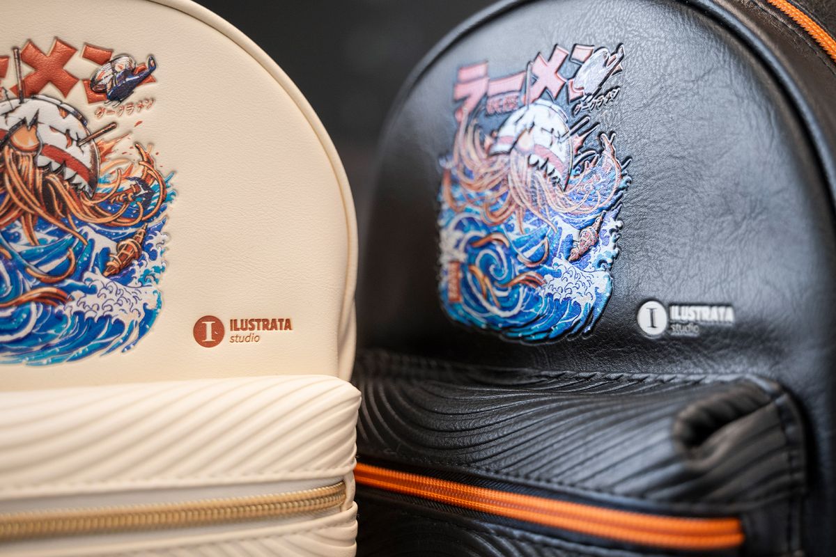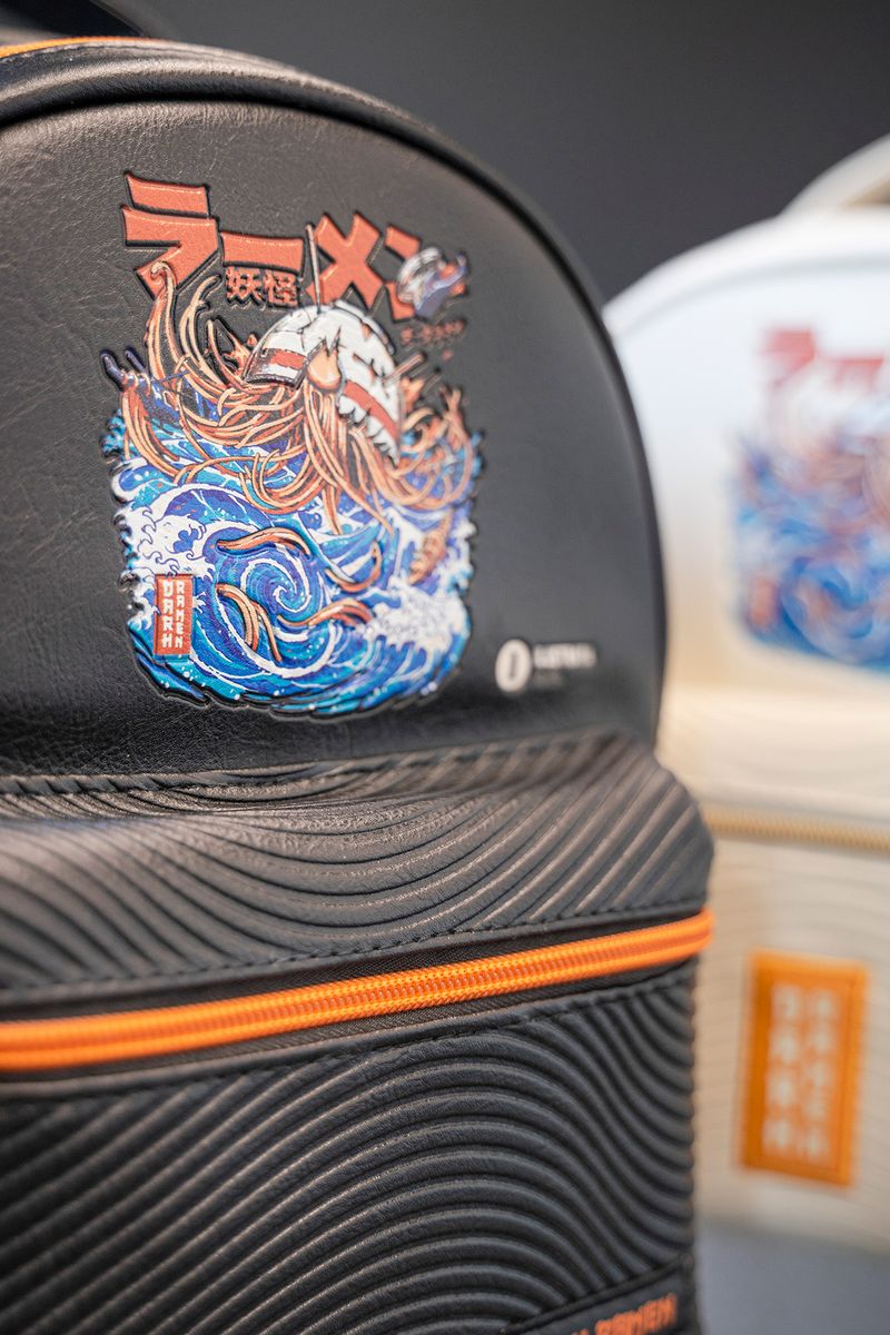 Der Rucksack zeigt eine im Wasser tobende Ramenschüssel.