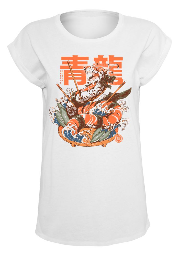 Das Shirt zeigt einen Drachen, der aus Sushi besteht.