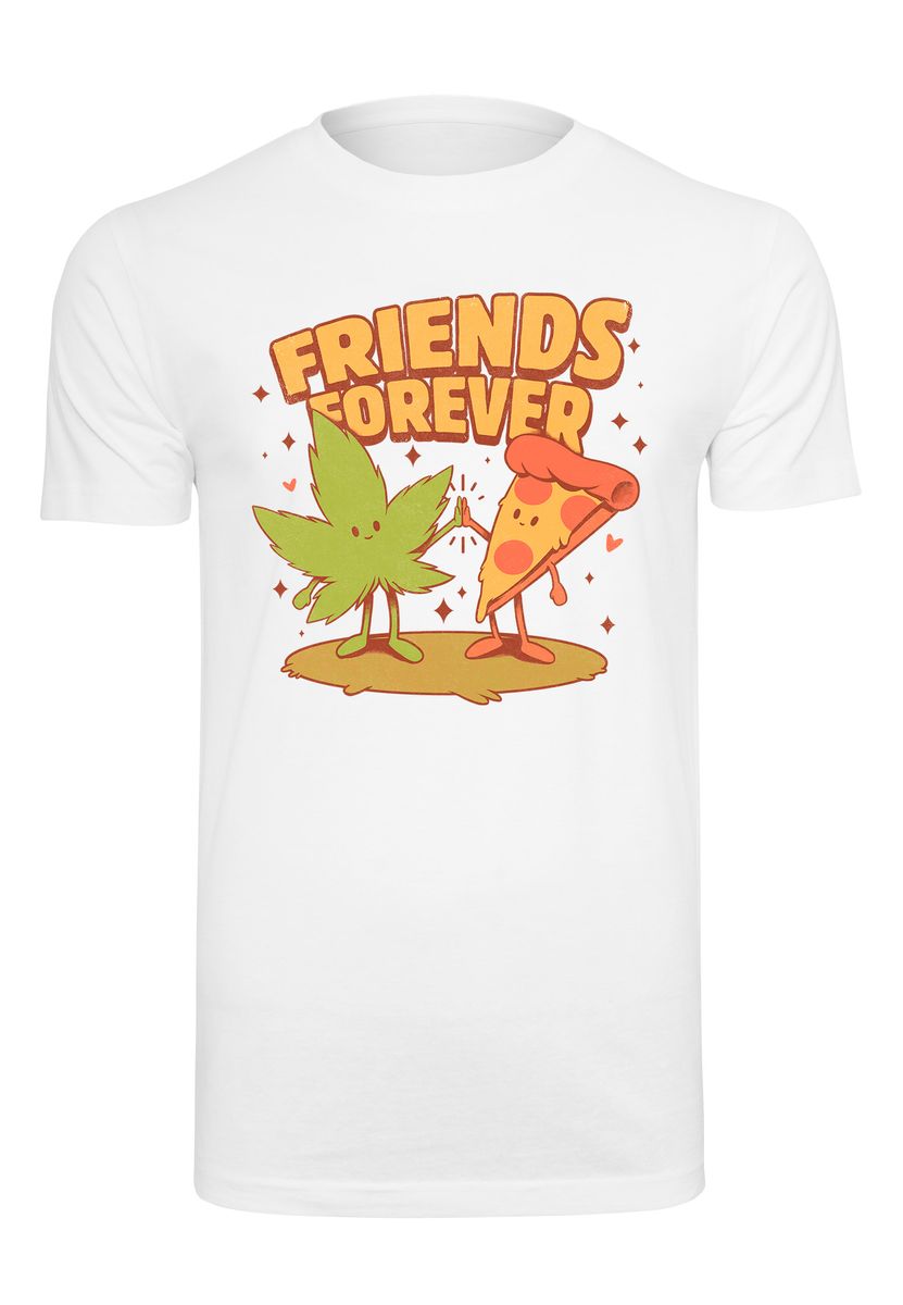 Das T-Shirt zeigt ein Hanfblatt und ein Stück Pizza, die sich ein High Five geben.