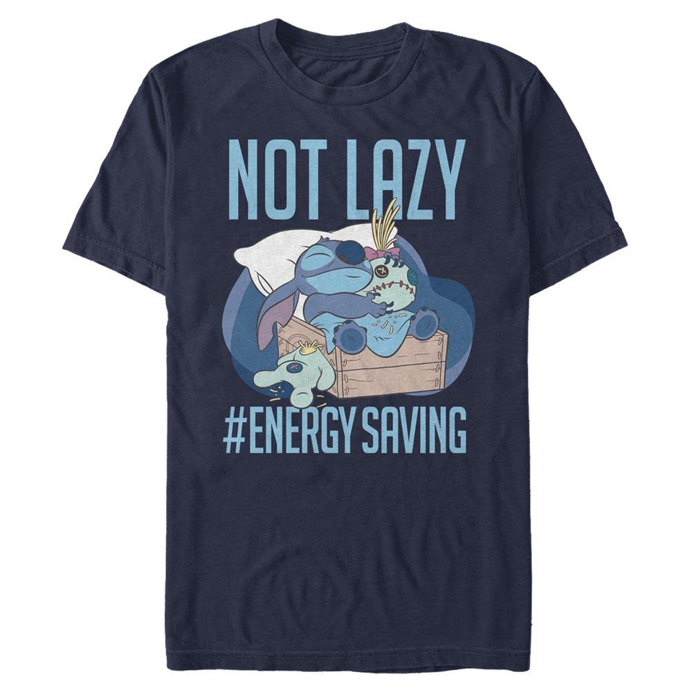 Das T-Shirt zeigt einen schlafenden Stitch. Dazu steht geschrieben "Not Lazy #SavingEnergy".