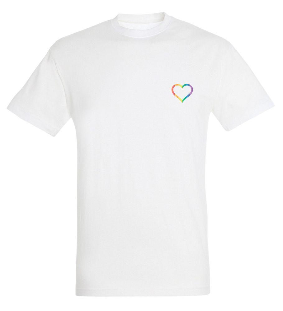 Das weiße Shirt zeigt ein kleines Herz in Regenbogenfarben.