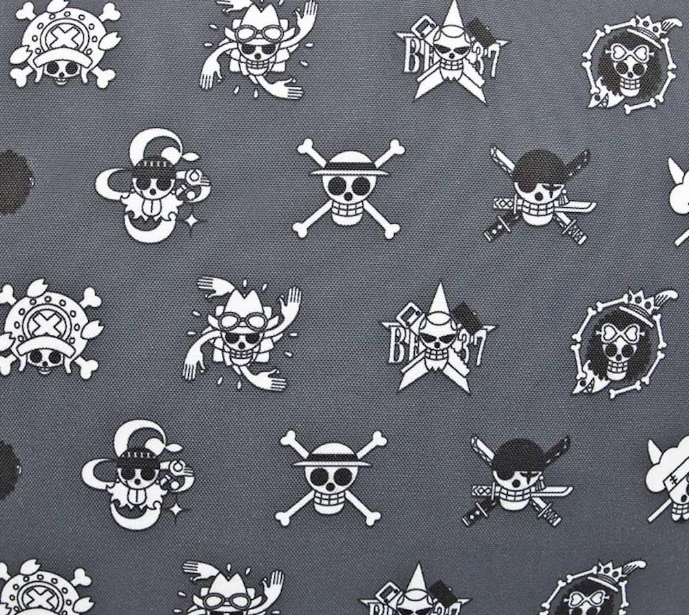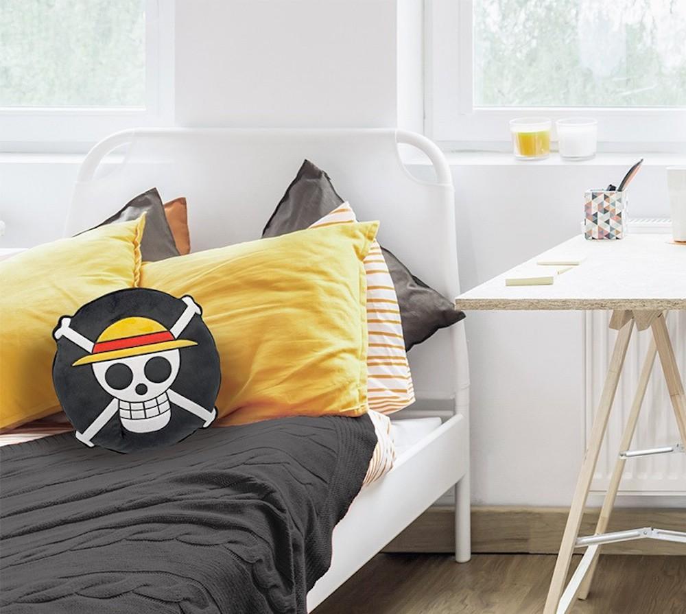 Auf dem kuscheligen Kissen sieht man die Flagge von One Piece bzw. den Jolly Roger der Strohhut-Piratenbande von Ruffy. Hinten sieht man die anderen Logos der Piraten.