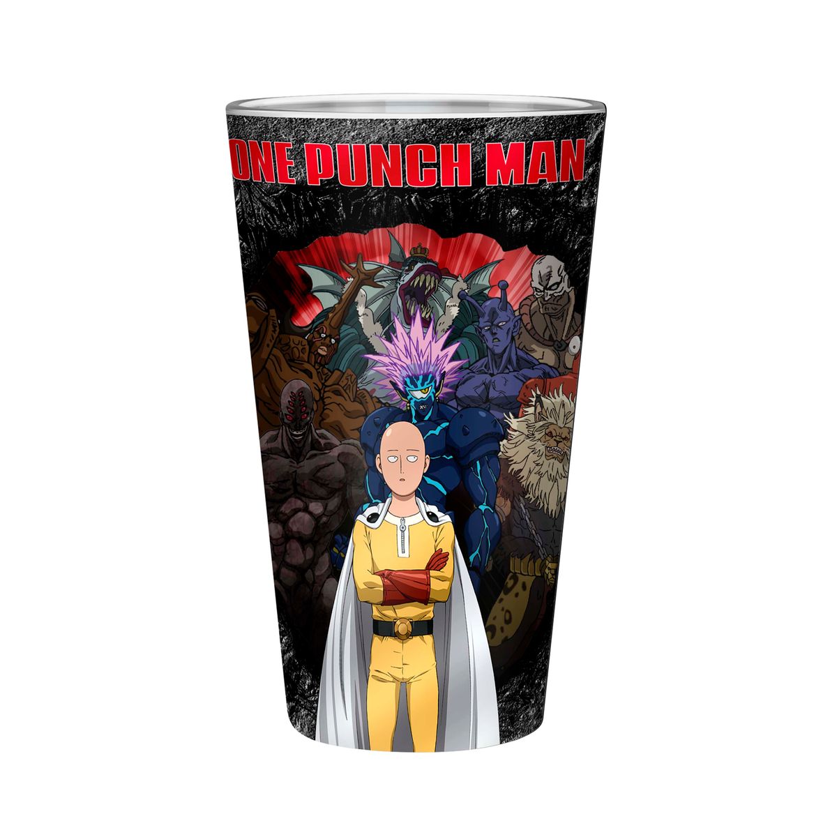 Das Glas zeigt Saitama und die anderen Helden aus One Punch Man.