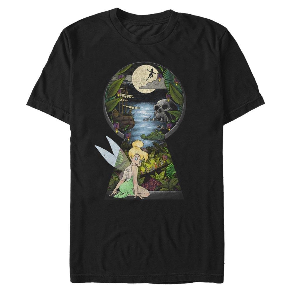 Das T-Shirt zeigt Nimmerland durch ein Schlüsselloch. Vorne sitzt Tinkerbell.