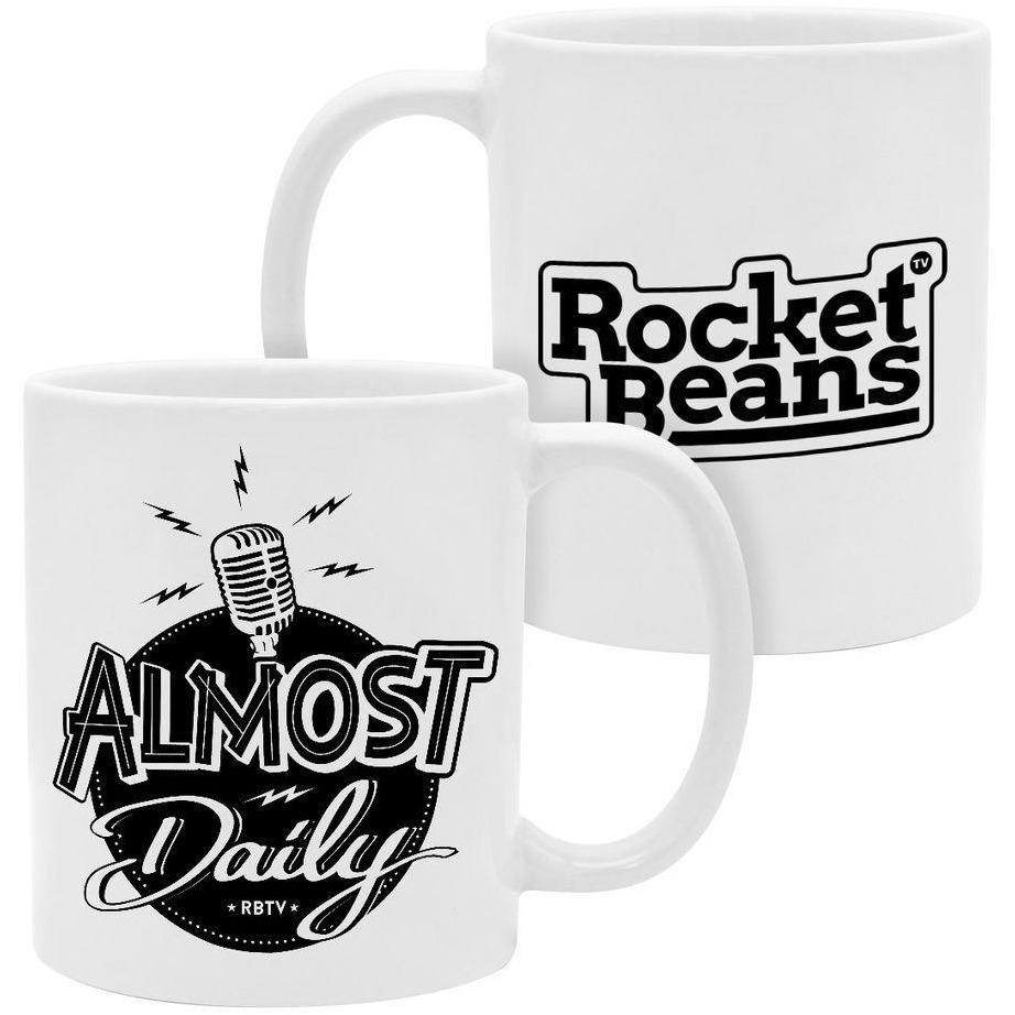 Die Tasse zeigt ein Mikrofon und den Spruch "Almost Daily".