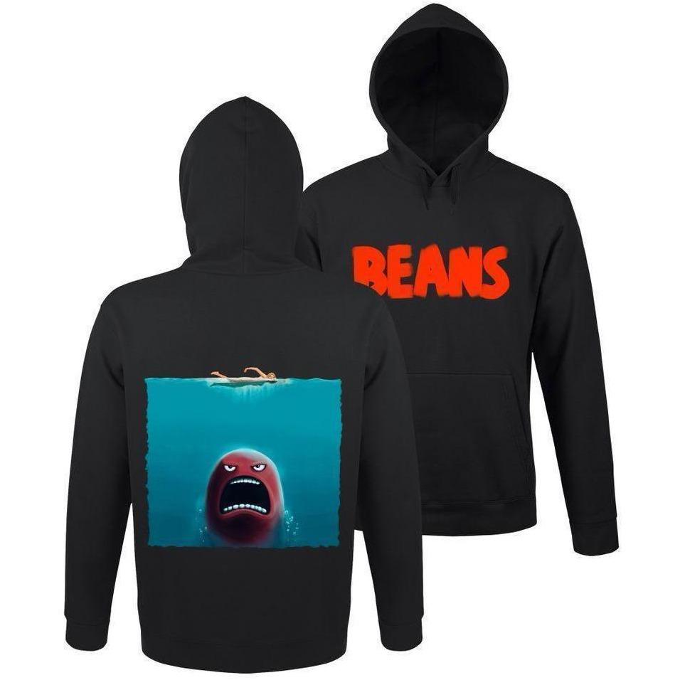 Der Hoodie zeigt vorne den Slogan Beans und hinten die Bohne im Stil des Weißen Hai Filmplakats .