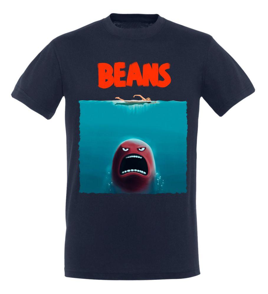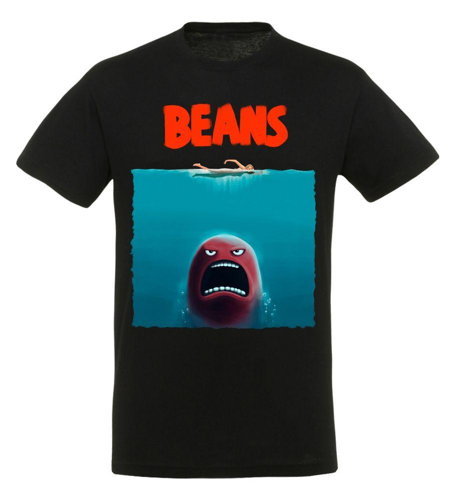 Das T-Shirt zeigt die Bohne im Stil des Weißen Hai Filmplakats